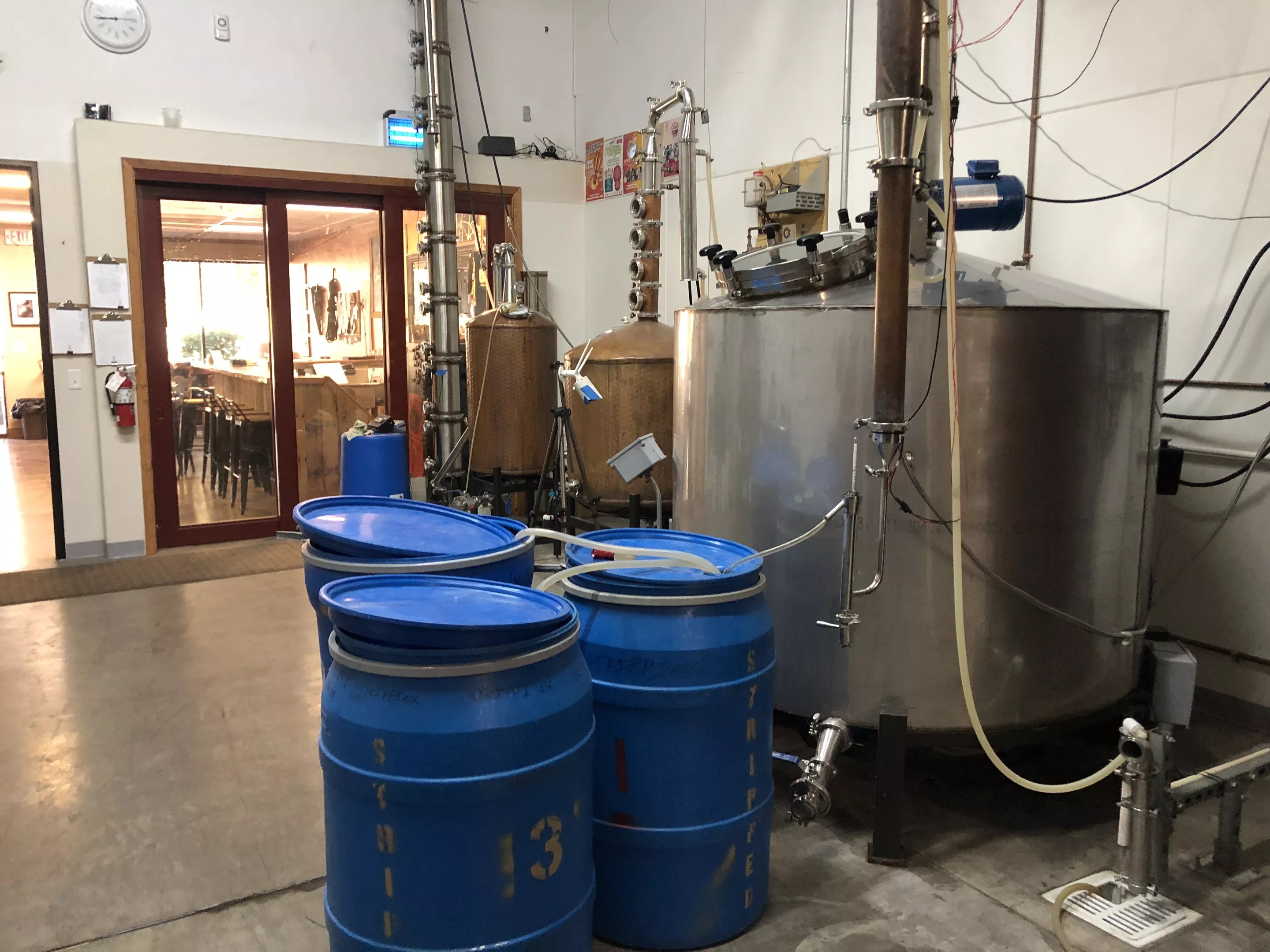 The distillery’s grain mill was built in a garage. It crushes grains and corn, reducing them to a coarse grind, larger and rougher than wheat flour. Next, the distilling process passes to a 17-barrel mash tun, a cylindrical vessel, where grain or corn is heated with water. This produces a beer-like slurry, which then passes together with the solids (unlike in brewing) to a 600-gallon stripping still. The mixture then “boils like mad.”