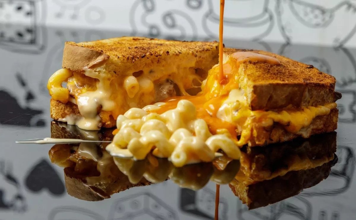The Best of Both Worlds sandwich is stuffed with baked mac and cheese, slow-cooked short rib, white cheddar cheese, and American cheese finished with barbecue sauce.