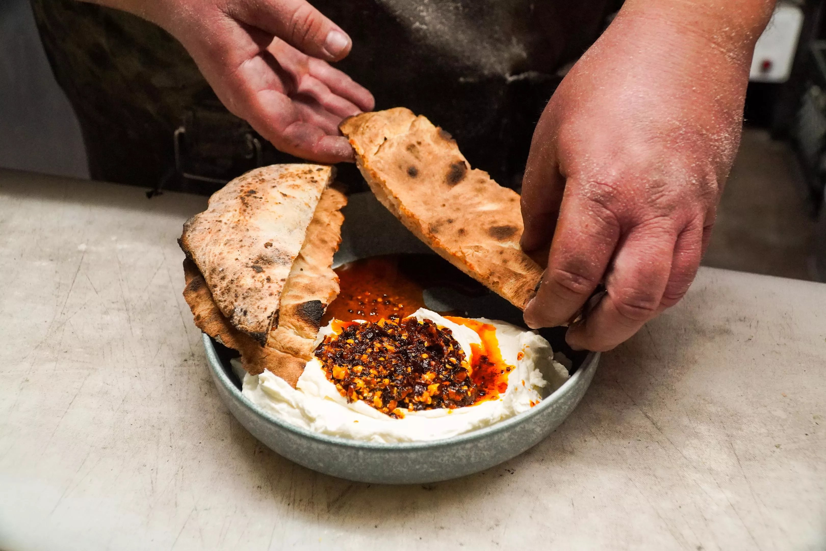 Moreno’s whipped ricotta is presented with a healthy amount of Calabrian chile oil and blocky wedges of lightly charred bread made with Caputo flour.