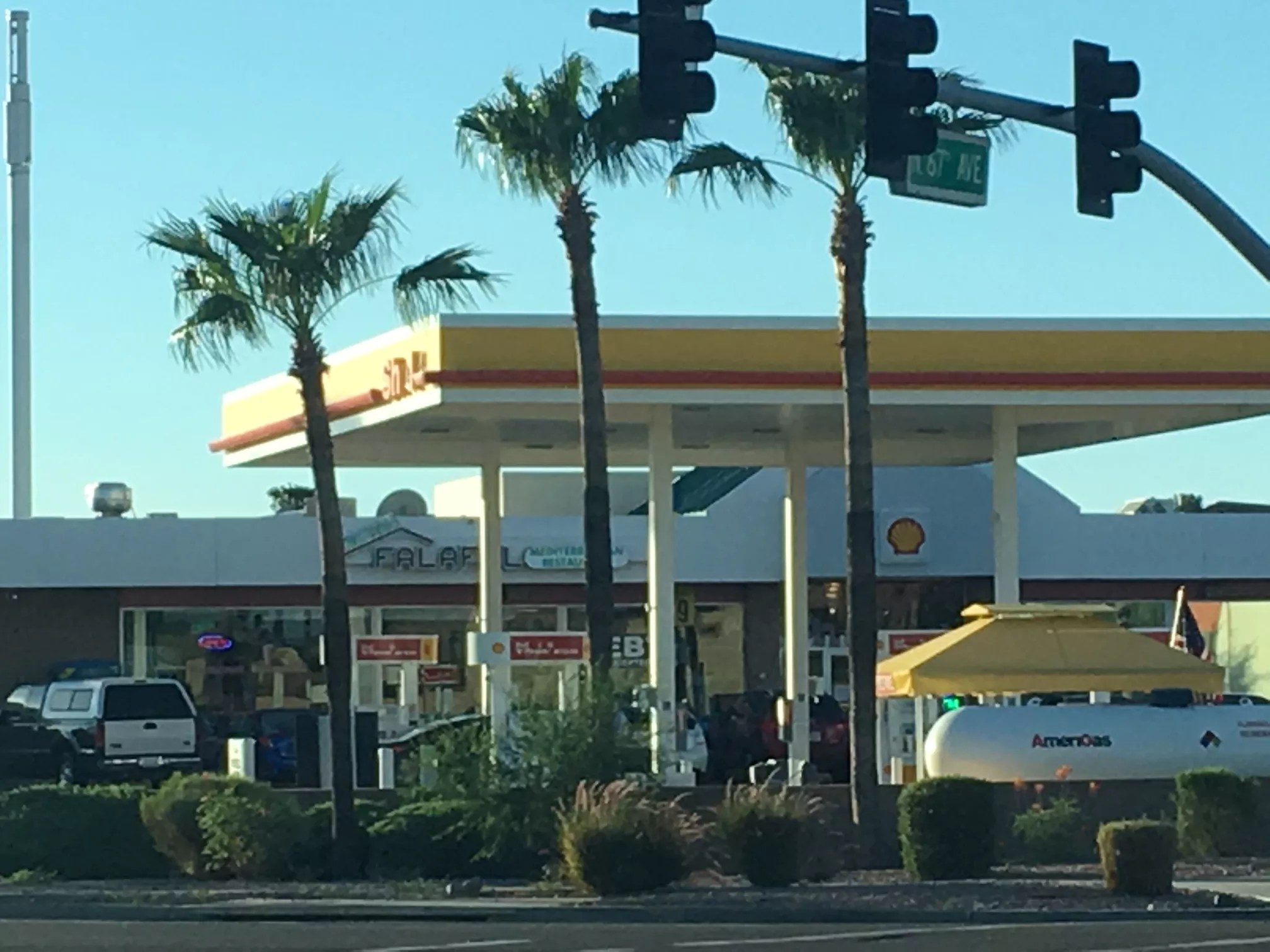 There’s a neon sign on the exterior of a Shell gas station near the intersection of Cactus Road and 67th Avenue in Peoria.