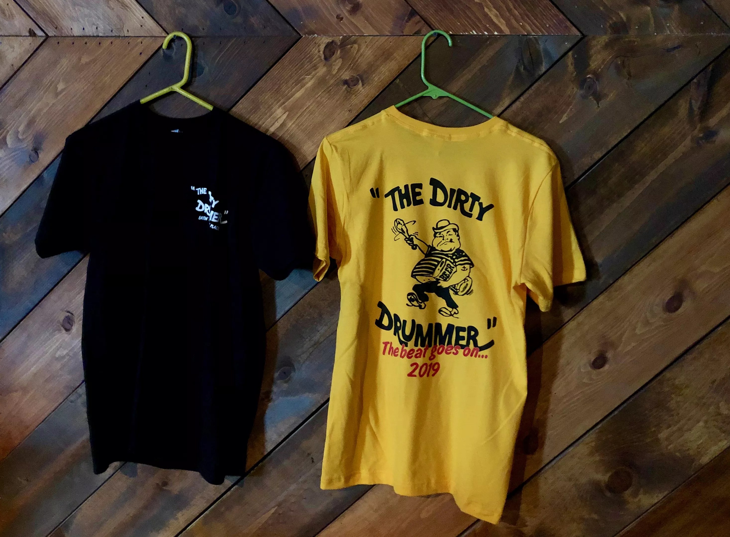 Add a classic black tee (pictured not so well on the left) to your order from The Dirty Drummer.