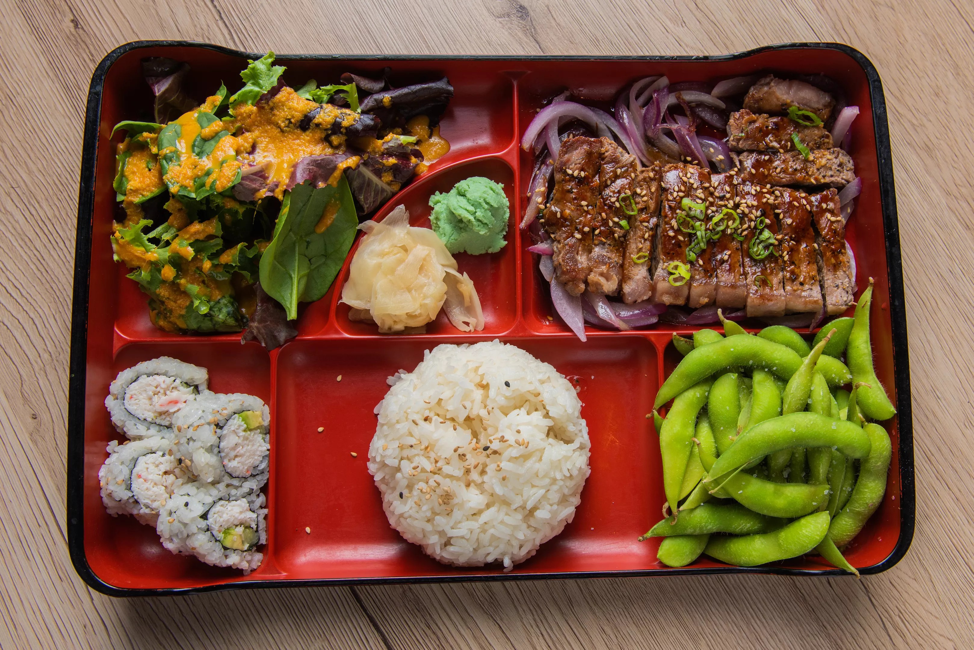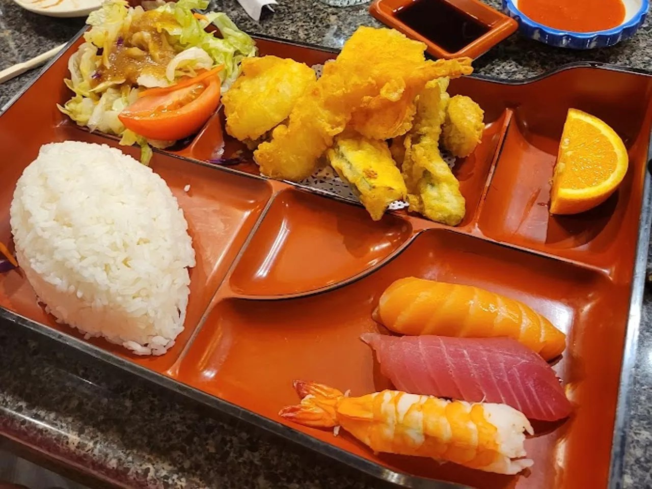 Multiple Locations This hip sushi spot with multiple locations and a full bar has speakers playing current pop music. Sushi Brokers offers its bento box selection from 11 am to 3 p.m. Options include an $11 sushi lunch bento featuring a California roll with one piece each of yellowtail, tuna and salmon. Upgrade to a $15 specialty bento that includes a choice of specialty roll rather than a California roll. Sushi Brokers’ bento box lunches also come with sides of miso soup, cucumber salad, white rice and wok-cooked veggies. This is one of the more generous portioned boxes on the list. Those who don’t love sushi can also enjoy alternative bento box options with tempura shrimp, teriyaki chicken or chicken katsu.