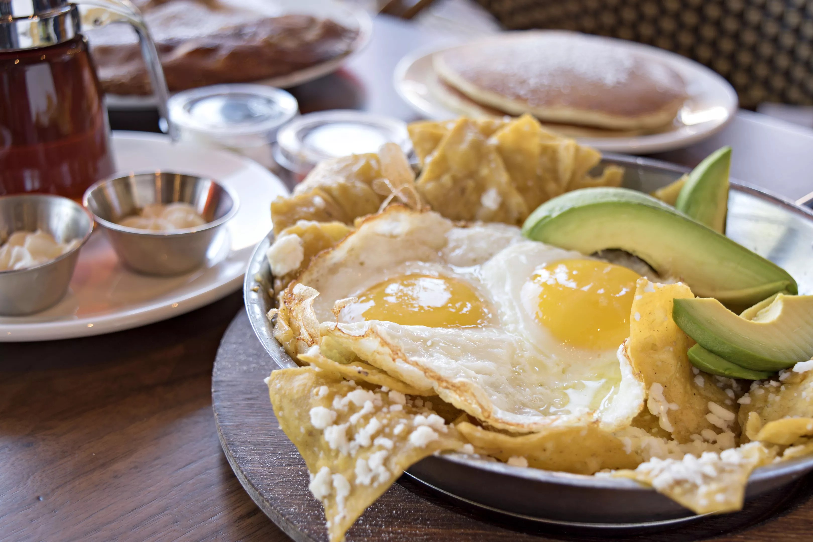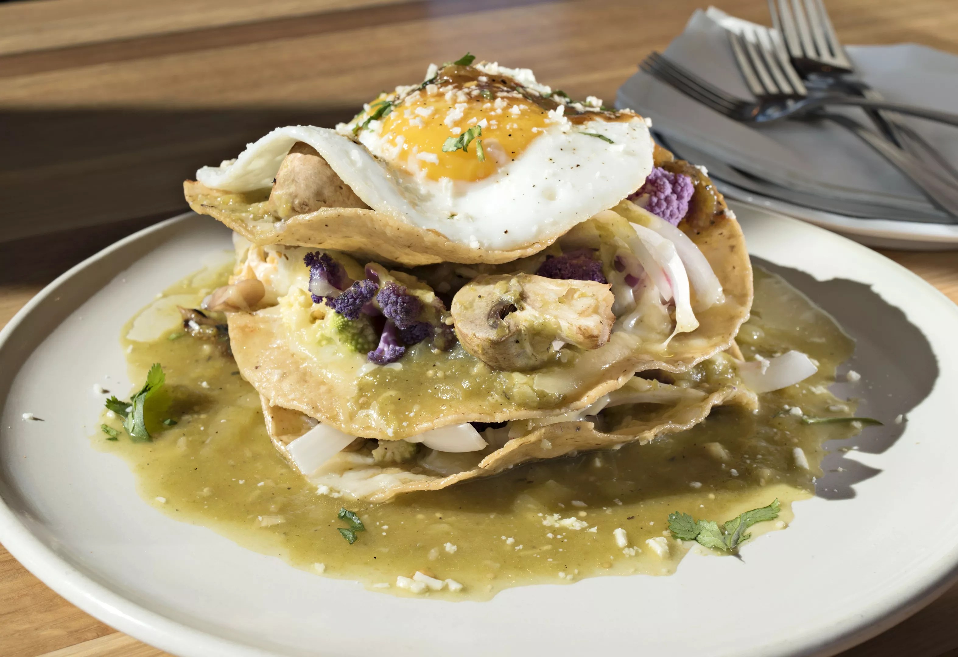 This local breakfast and brunch chain knows how to put together a plate of chilaquiles. At Over Easy, the chilaquiles dish consists of corn tortilla chips loaded with chicken, two eggs, cheddar cheese, ranchero sauce, pico de gallo, sour cream, and green onion. And the order is gluten-free to boot.