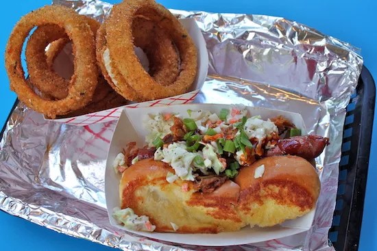 Joe’s Farm Grill rolls out its “Dog Days of Summer” menu every September, featuring nearly a dozen hot dogs. For the remaining 11 months of the year, the grill keeps a few dogs permanently on the menu, including the Carolina Dog. Made by loading pulled pork, Joe’s Real BBQ sauce, and coleslaw atop an all-beef, natural-casing hot dog from local Schreiner’s Fine Sausage, the Carolina Dog makes eating on the back patio of the farm-to-table restaurant feel even more like a neighborhood picnic. The pulled pork is juicy and expertly seasoned with Joe’s in-house barbecue sauce, and the natural-casing hot dog – which lends a satisfying crunch to each bite – tastes like a relic of days gone by.