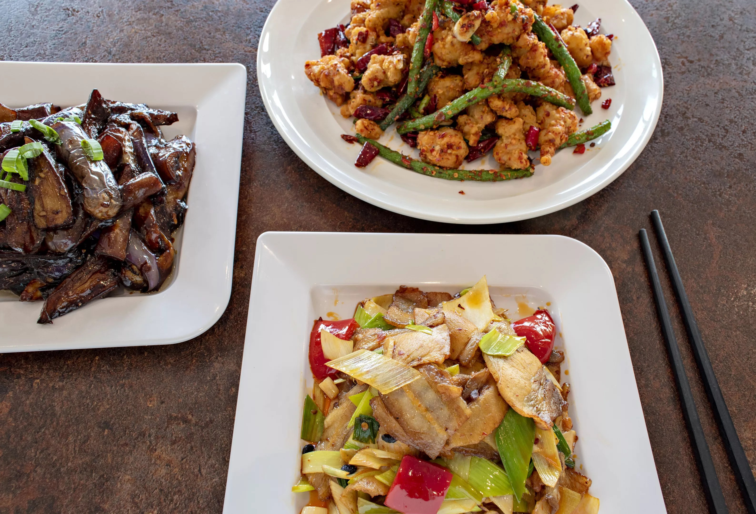 Twice-cooked pork, eggplant, and Chonqing chicken from Old Town Taste.