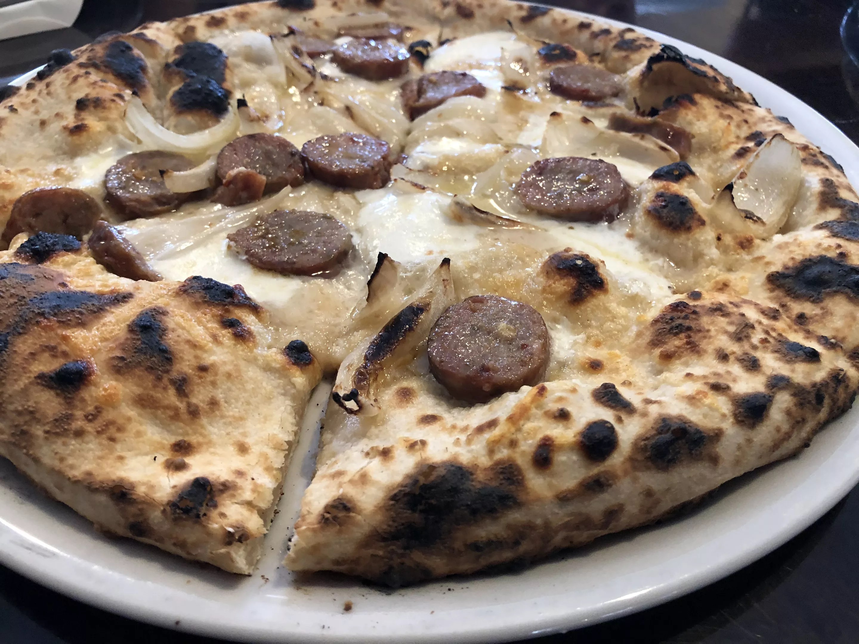This interesting pie from Craft 64 will likely find friends and enemies. What fascinates me about this one is that, in my eyes, the pizza has a bready quality, a spirit almost as much calzone or stromboli as pizza. The sausage coins and onion have been smoked. Smoke seems to release the onion’s most spellbinding latent flavors, giving the translucent petals light smoke, toning down the sharp aromatics, and converting them to a sweetness that is almost haunting in its transiency. Toppings are sparse. The pie is pretty minimal. That’s where the bready nature rises from, these qualities, the puffiness, and the molten swaths of cheese. This pizza is on the reserved end of the spectrum. It’s a pizza interesting in its minimalism and worthy for a dusky change of pace.