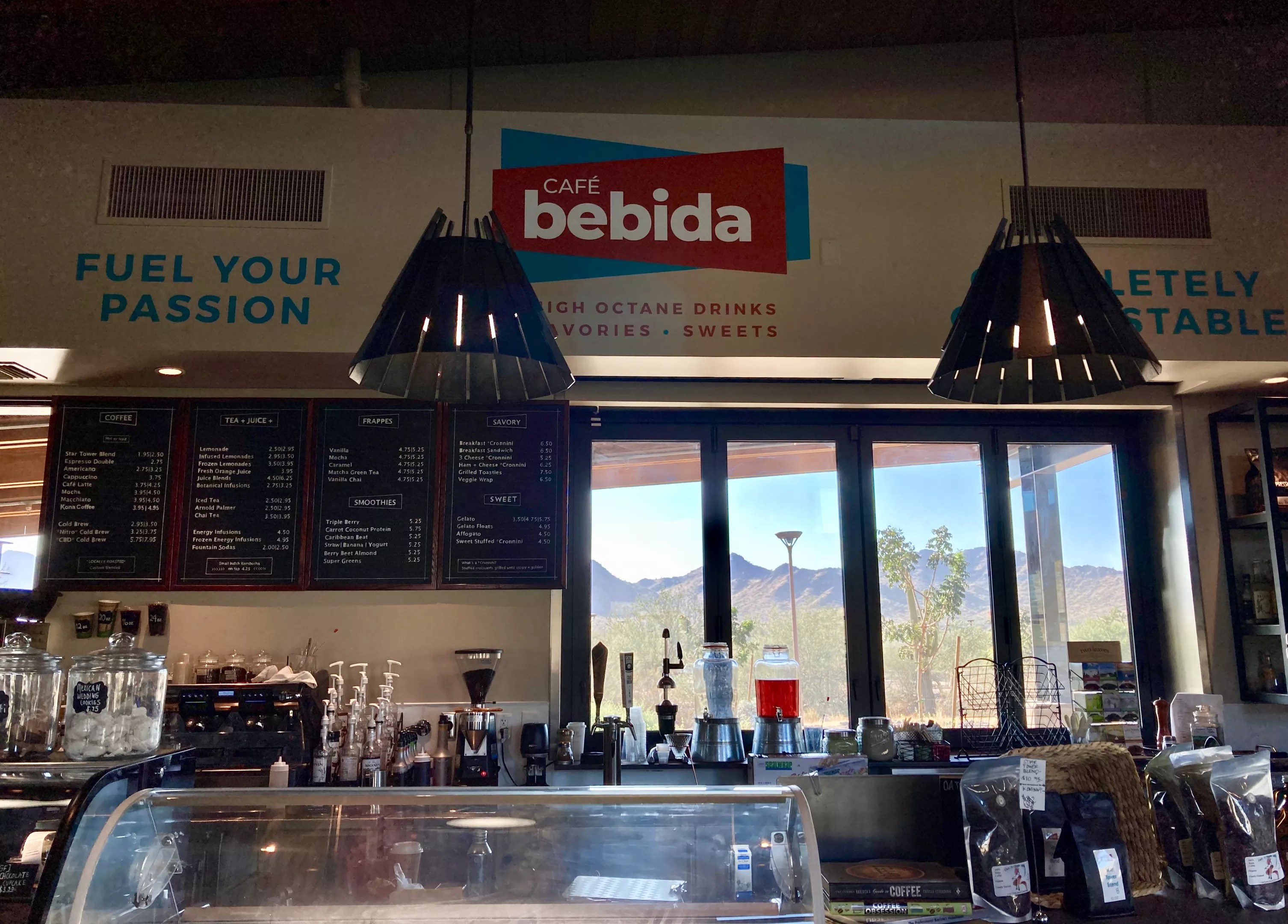 Café Bebida is located at Estrella Mountain Ranch, surrounded by 20 miles of multi-use trails and neighboring the Copper State Bike & Hike shop. Owner Deborah Huyer offers coffee sourced from her family’s farm in Kona, Hawaii, in the form of Nitro cold brew, Americanos, and vanilla chai frappes. Menu items include the 3 Cheese Cronnini, a turkey pesto toasti, and a bakery case packed with pastries. Tables and chairs are scattered outside of the café, in full view of the scenery.