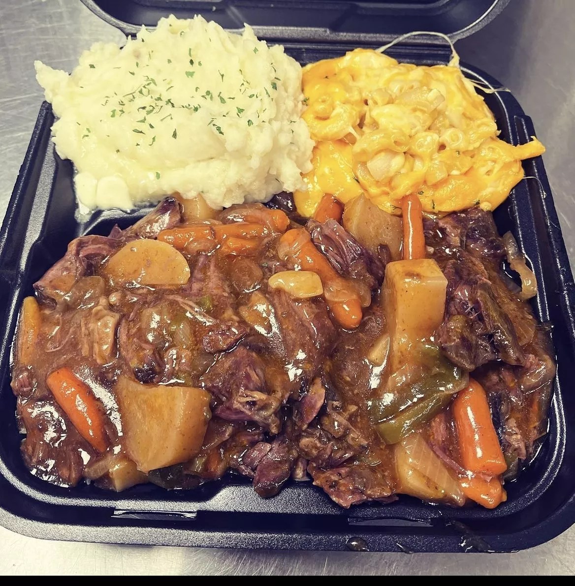 “My personal favorite is the jerk salmon or the beef pot roast,” Harris-Durham says. “The mac and cheese is bomb, that’s my favorite side. And my favorite dessert is the strawberry banana pudding.”