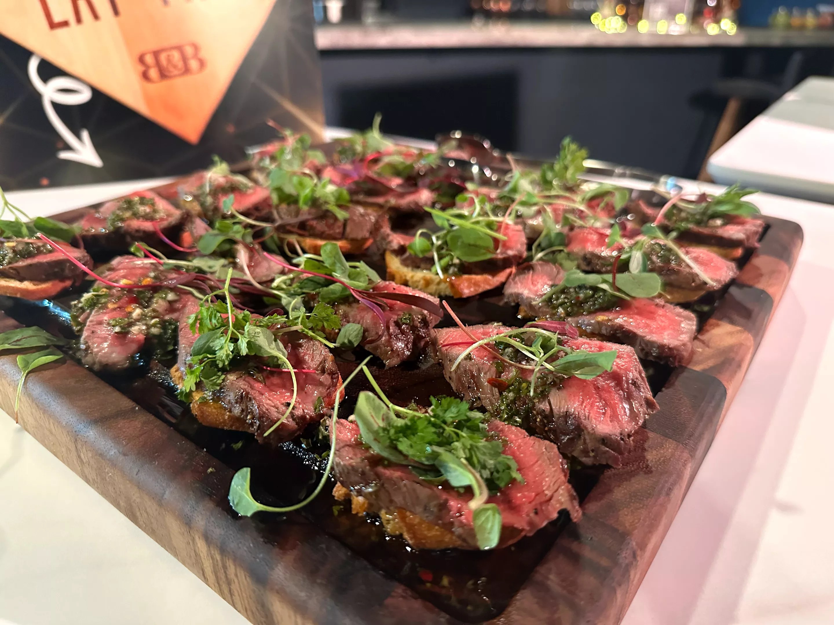 Customers can pair cocktails with small bites, such as Prime Steak Crostini with chimichurri, at Bourbon & Bones.