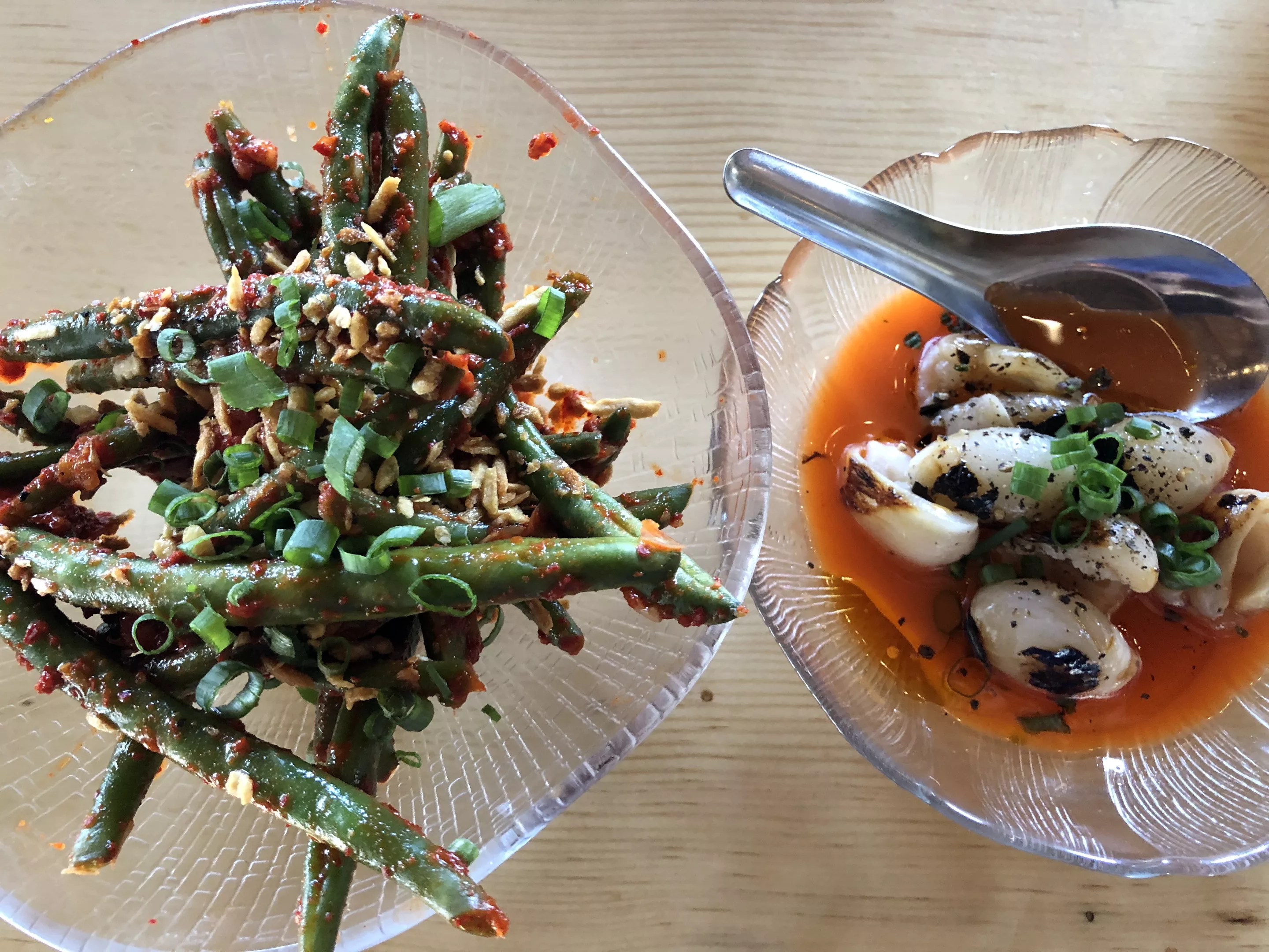 And finished, duck appears in three ways. One: simply roasted legs. Two: coated in fiery chile sauce. Three: as half-bird platters with various sides.