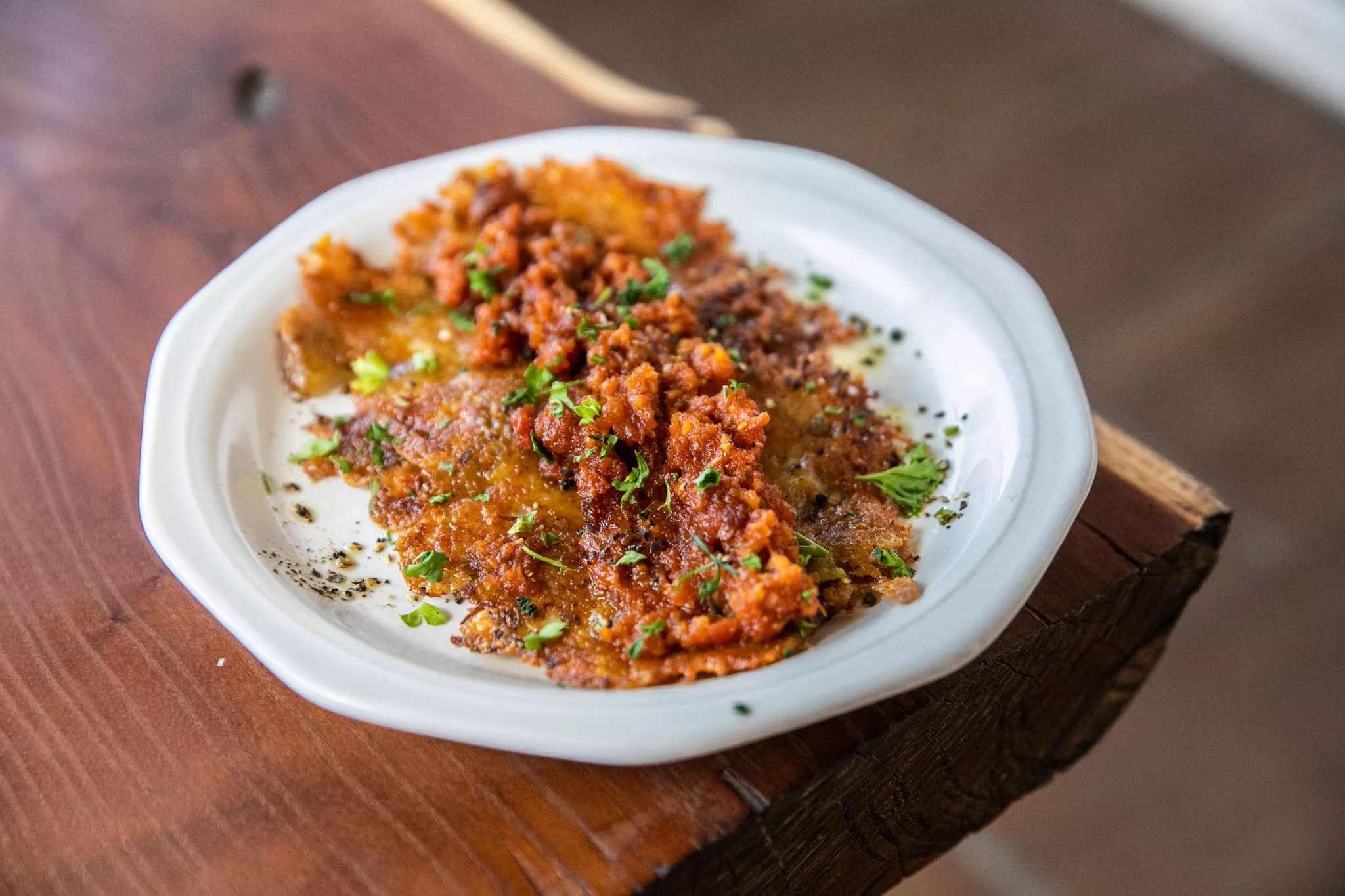 Frico caldo, a riff on a northern Italian potato-cheese crisp, is a little more uneven. Pan-fried cheese, shaped into a thin wafer, dovetails against a loose, herb-spackled potato pancake. It’s messy, but has the allure of old-fashioned comfort food: crispy and richly savory. The dish’s flavors are nicely sharpened by a sweet and tangy tomato relish.