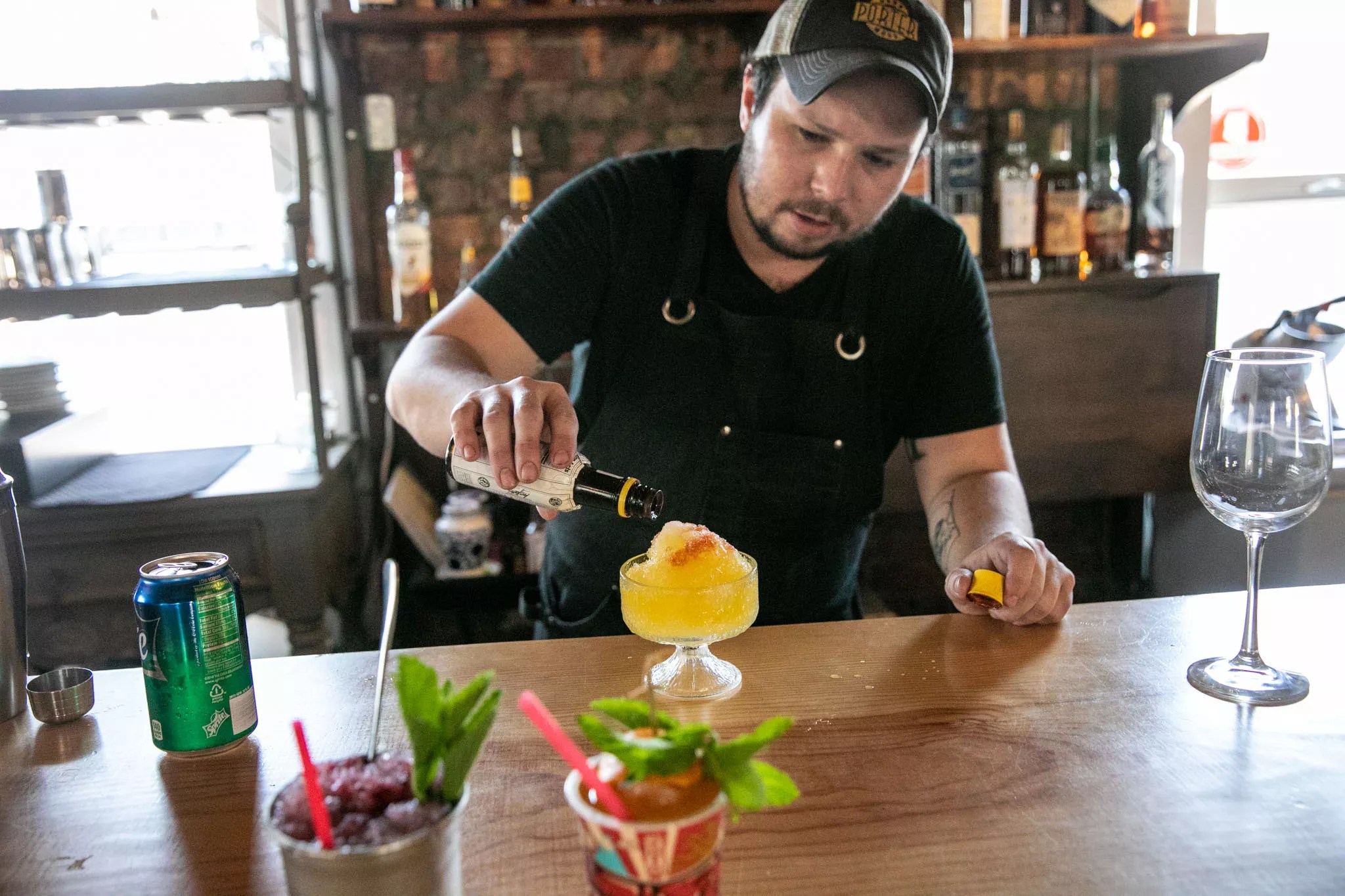 Before you dig into the chef’s small but compelling menu, it’s worth exploring Bri’s cocktail program. There are plenty of novelty seasonal drinks on hand – the summer cocktail list includes drinks like the Brilini, a blend of sparkling wine and peach liqueur, served with a house-made tart cherry ice pop. But bartender Michael Brown also mixes serious yet unfussy drinks, like the Carda-momma Said Knock You Out. Made with Commerce gin, lime, elderflower, and cardamom, the drink’s clean flavors are skillfully embellished with a spicy flash of aromatics.