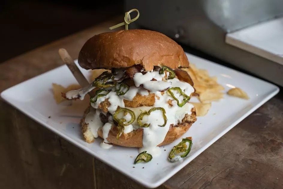 August 22, Fried Chicken Burger: beef patty, fried chicken, bacon, jack cheese, ranch, and jalapeno chips on a Hawaiian bun.