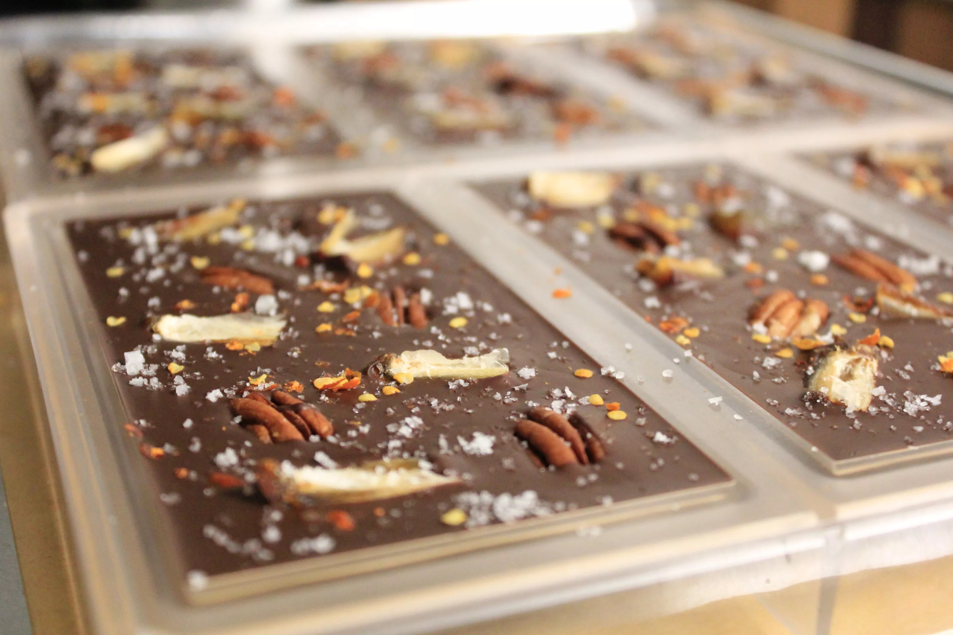 The chocolate bar itself is dark chocolate from Noi Cacao, salt from the Arizona-based See Salt Taste, Arizona pecans and dates, and chiltepin peppers from Andrade’s family ranch in Sonora, Mexico (which you can read all about in this installment of Sonoran Arcana). It is 100 percent vegan and gluten free, with a little bit of heat.