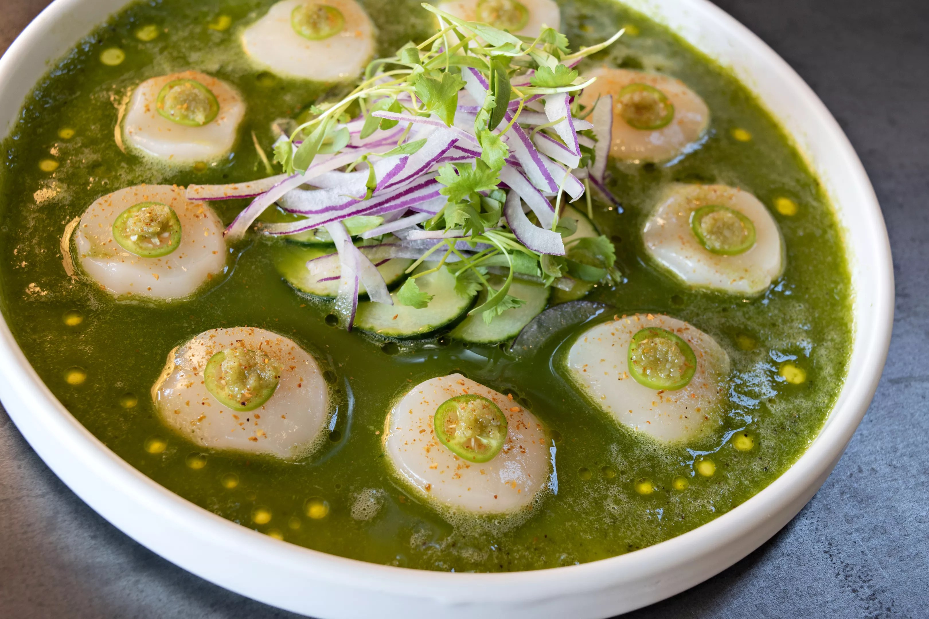 In a city blessed with aguachile options, Kaizen shoots its shot. A green sauce zinging with citrus and unripe chile heat checks a key aguachile box: the screamingly intense cool broth that gives the dish its name. Coin-thin scallops from Hokkaido, raw and slippery, encircle cucumber beneath herbs with intense grassiness. The herbaceous influence is a nice touch, jiving smoothly with delicately sweet slices of scallop.