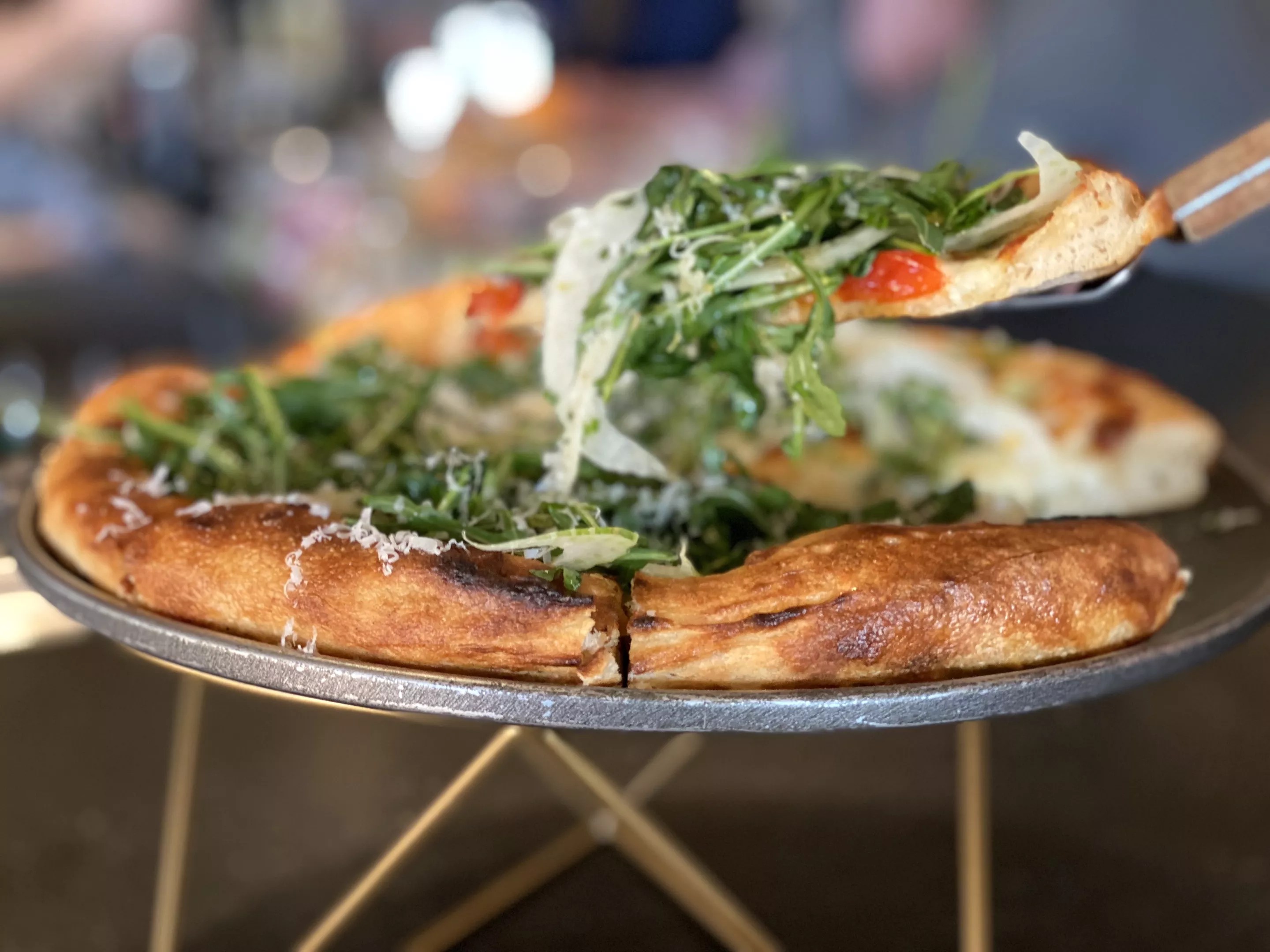 Pizza Insalata combines Fontina, Parmigiano, cherry peppers, fennel, arugula and hot honey on a puffy crust.