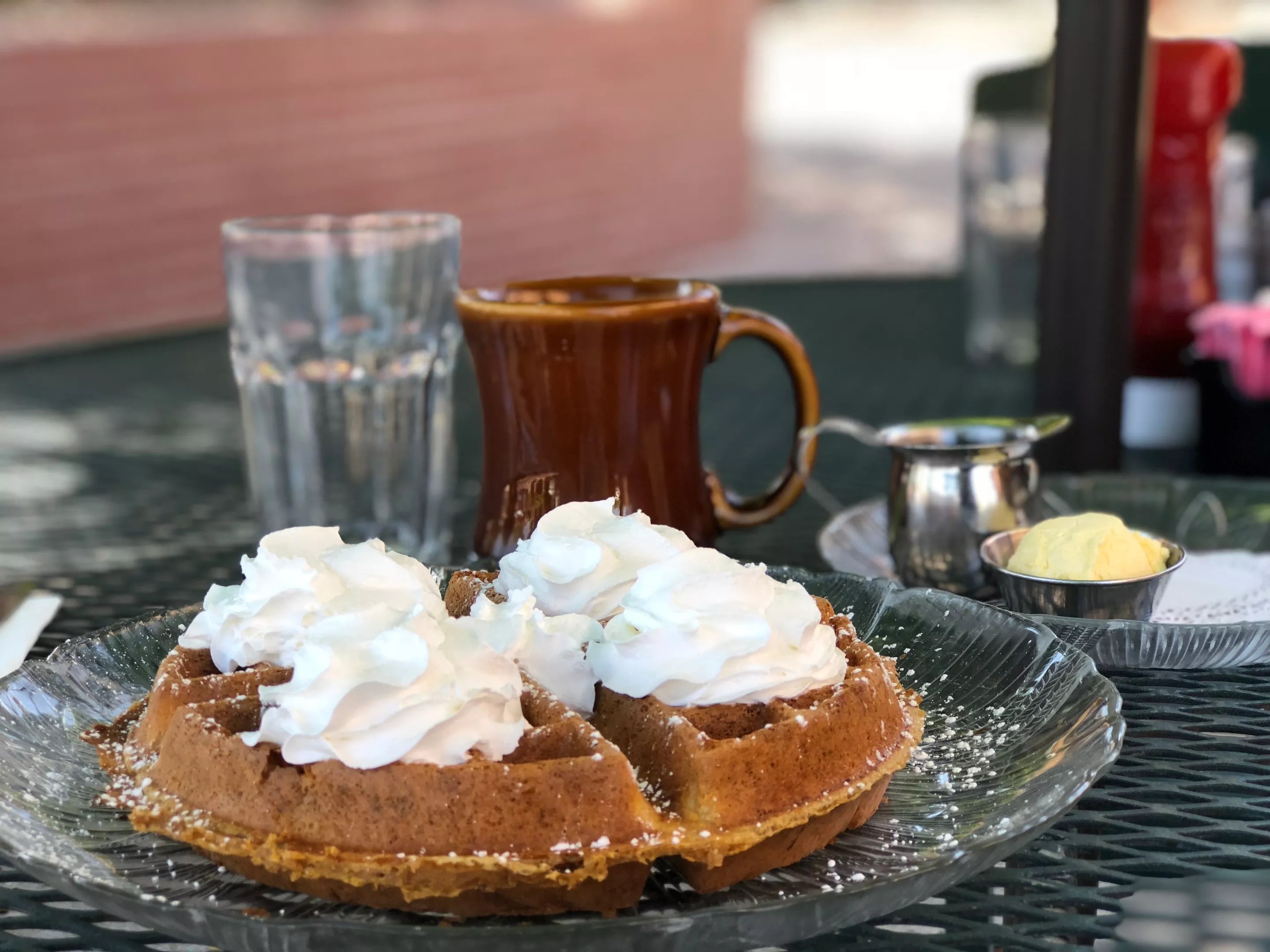 U.S. Egg serves pumpkin waffles made with whole wheat batter and pumpkin spice, then topped with powdered sugar and whipped cream. The restaurant also makes protein pumpkin waffles, pumpkin pancakes, pumpkin coffee, and a spiked pumpkin coffee made with whiskey and topped with whipped cream.
