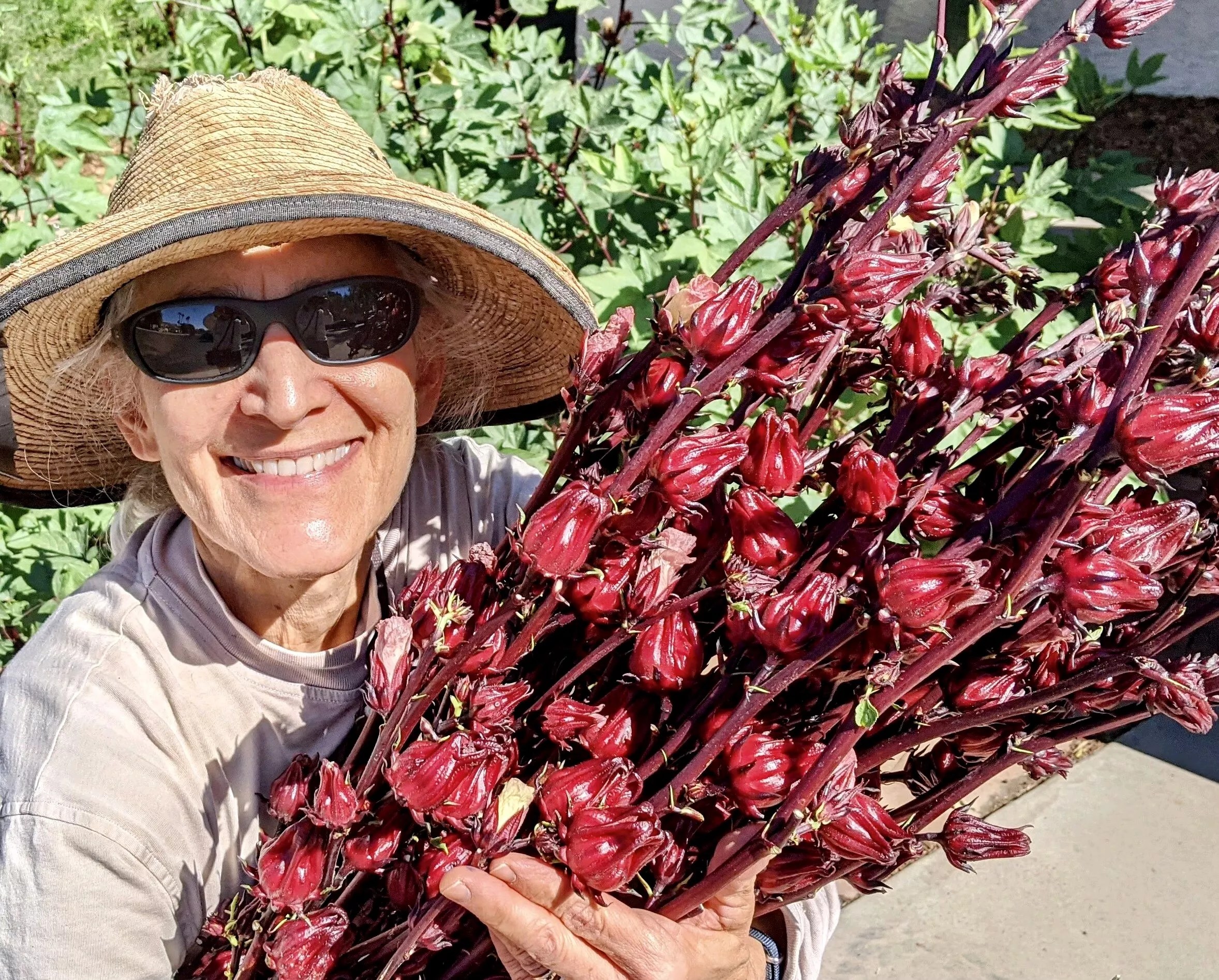 “My harvest for fresh hibiscus starts in October. When I offer fresh hibiscus, it goes with savory things. I created a salsa recipe with her customers. The dry hibiscus can be eaten plain or mixed with tea. You can enjoy it in lots of different ways. You can even make candied hibiscus,” says Heller.