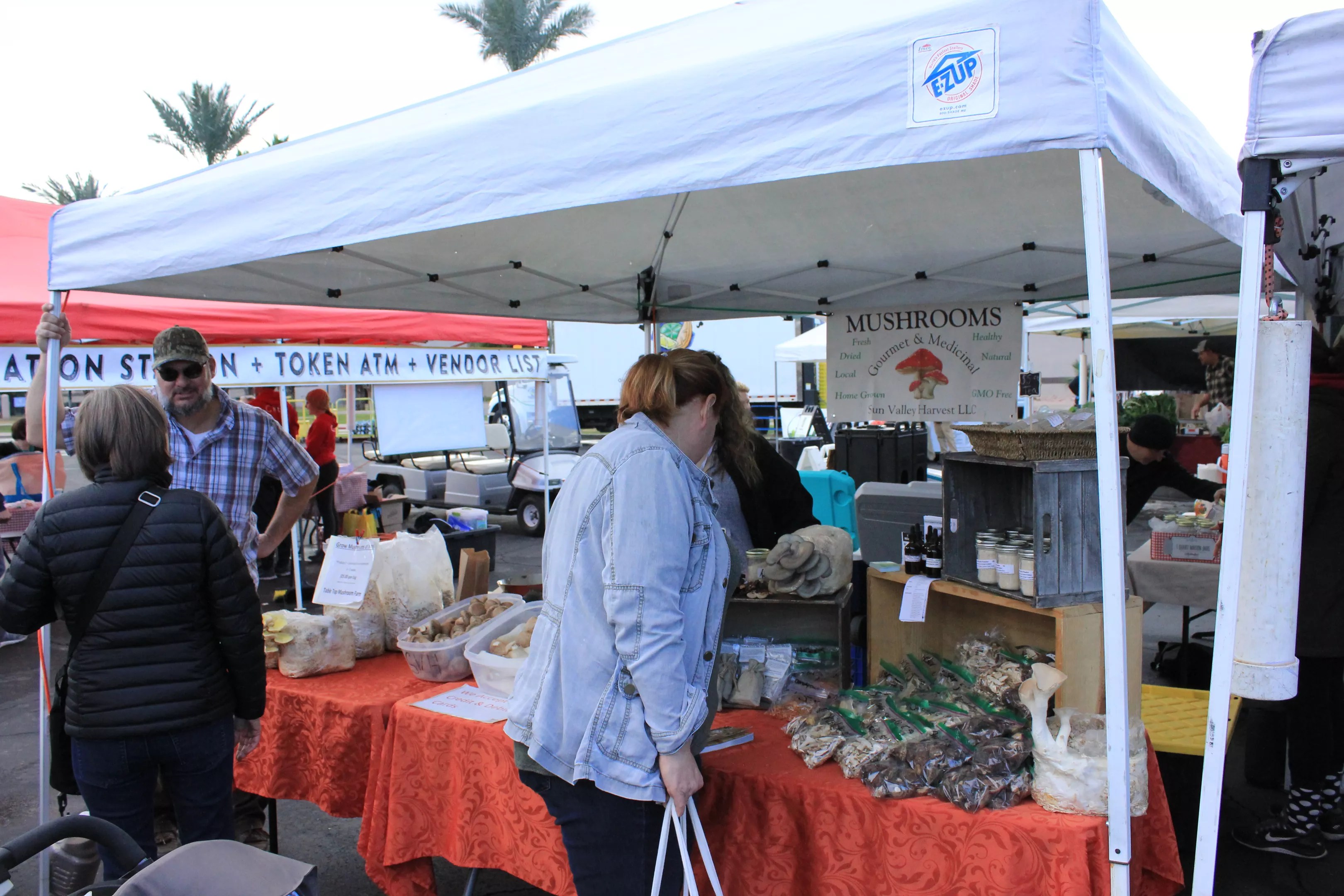 Badman checking out a mushroom stand at the Uptown farmers market.