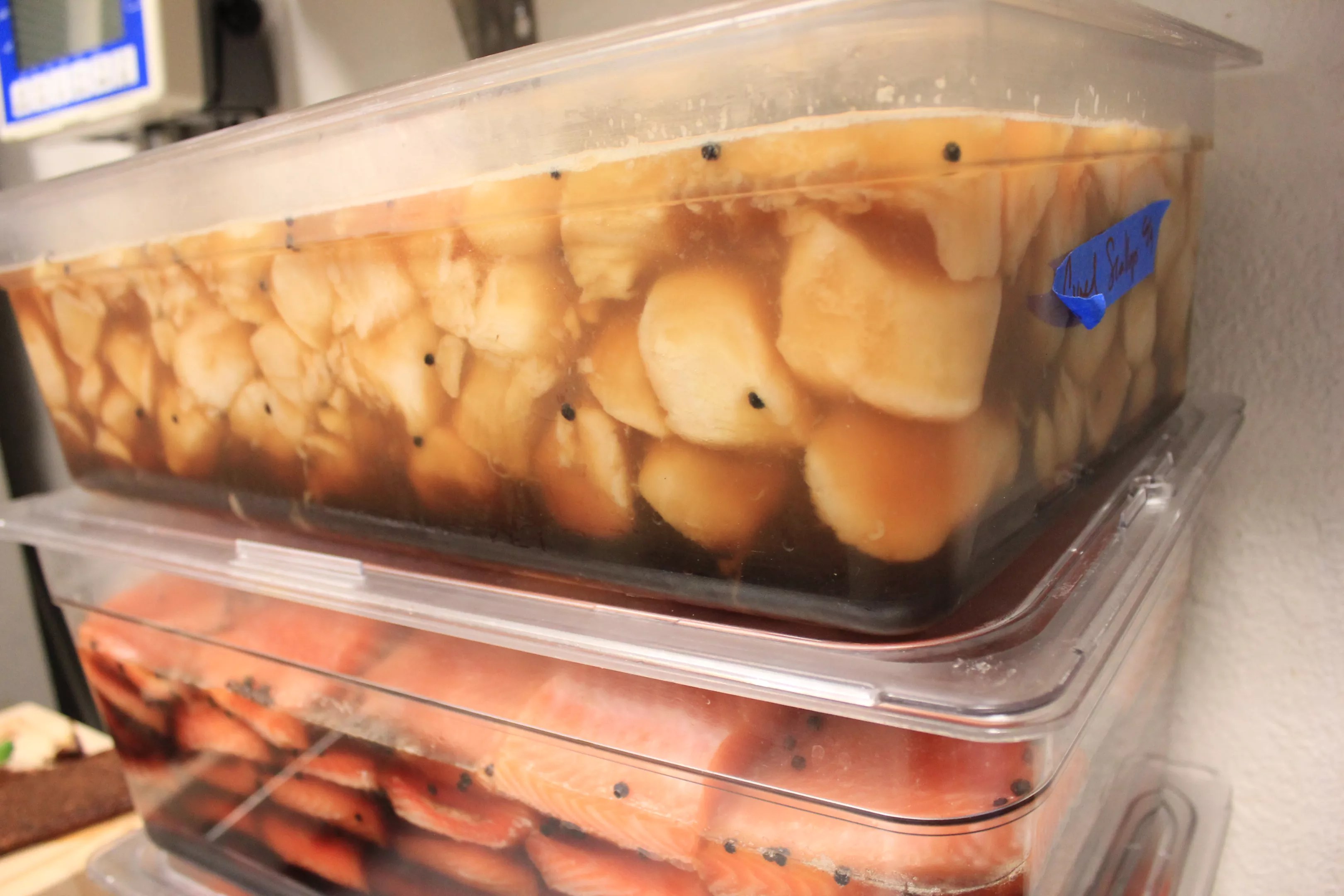 This is how the cure works: Sugar, salt, and black pepper go on the fish. The fish’s liquors and other essences are drawn out, pooling containers with liquid. The fish changes over time. Scallops get a day and a half (more delicate) and salmon gets up to four days (more aggressive).