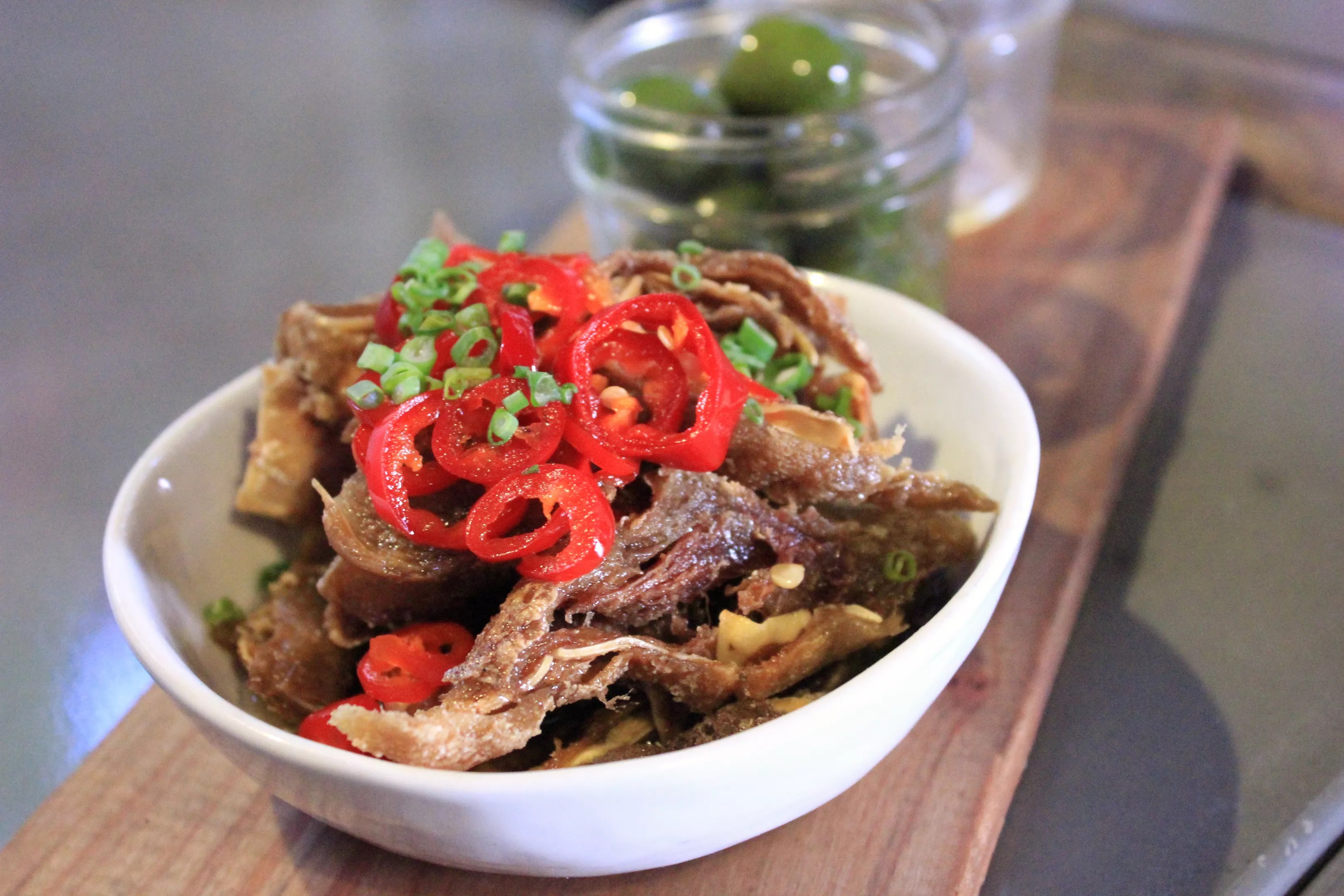 Strips of twice-fried pig’s ear, an eat made for drinks.