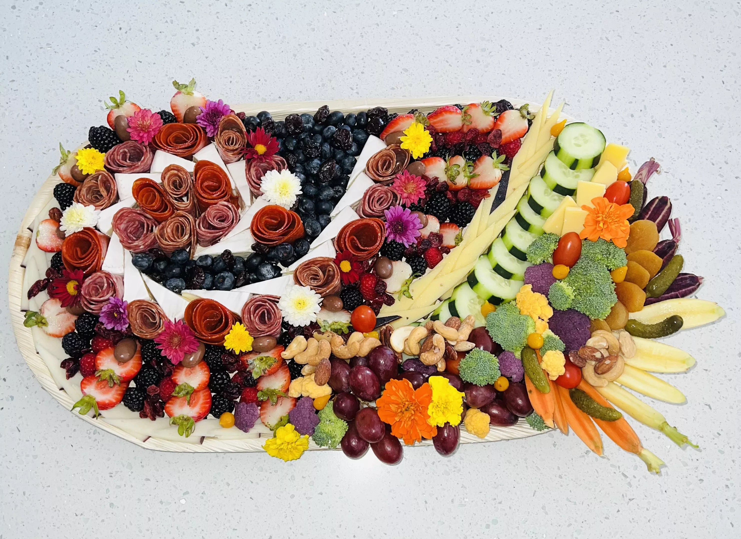 All of their meats and cheeses are imported or sourced from local farms. And their designs look like they belong in an art museum, with intricate geometric patterns made from pickles, crackers, fruits, and vegetables. The creations are both mesmerizing and delicious.