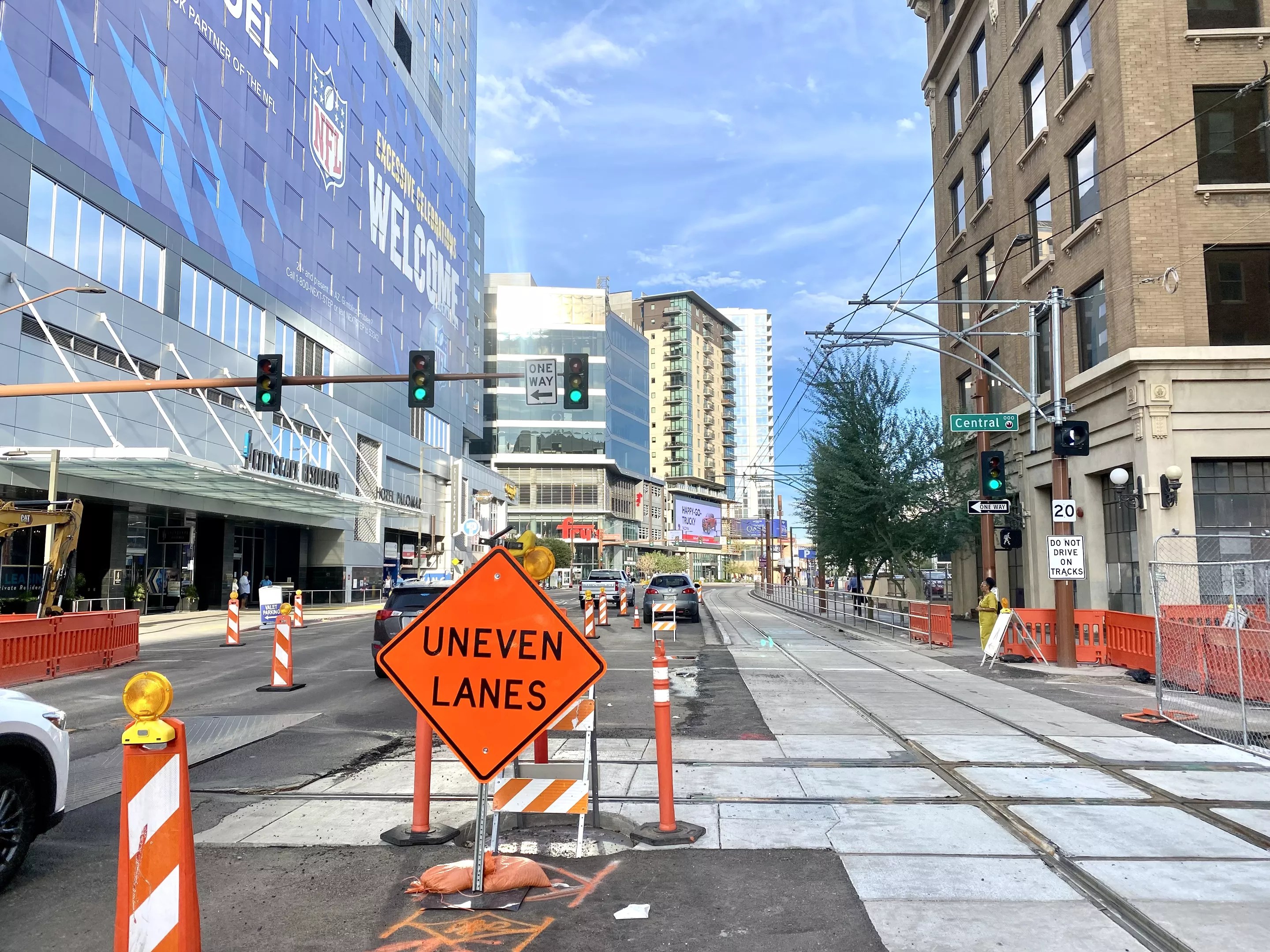 Uneven lanes and blocked roads are a regular downtown Phoenix occurrence during light rail construction.