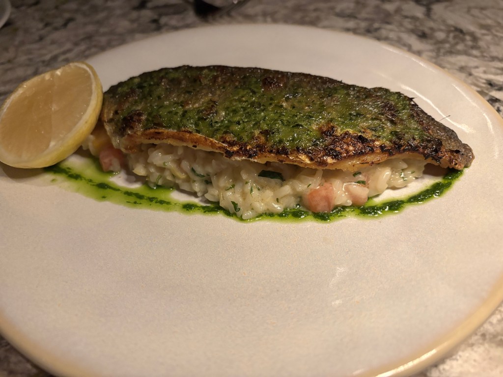 A fillet of flaky fish, crusted with fresh, green herbs, rested neatly on top of a scoop of long-grained basmati. The rice played more like risotto, studded with cubes of root vegetables, all enveloped in a creamy sauce. The rice was so buttery and so lemony, we marveled that the sauce hadn’t split.