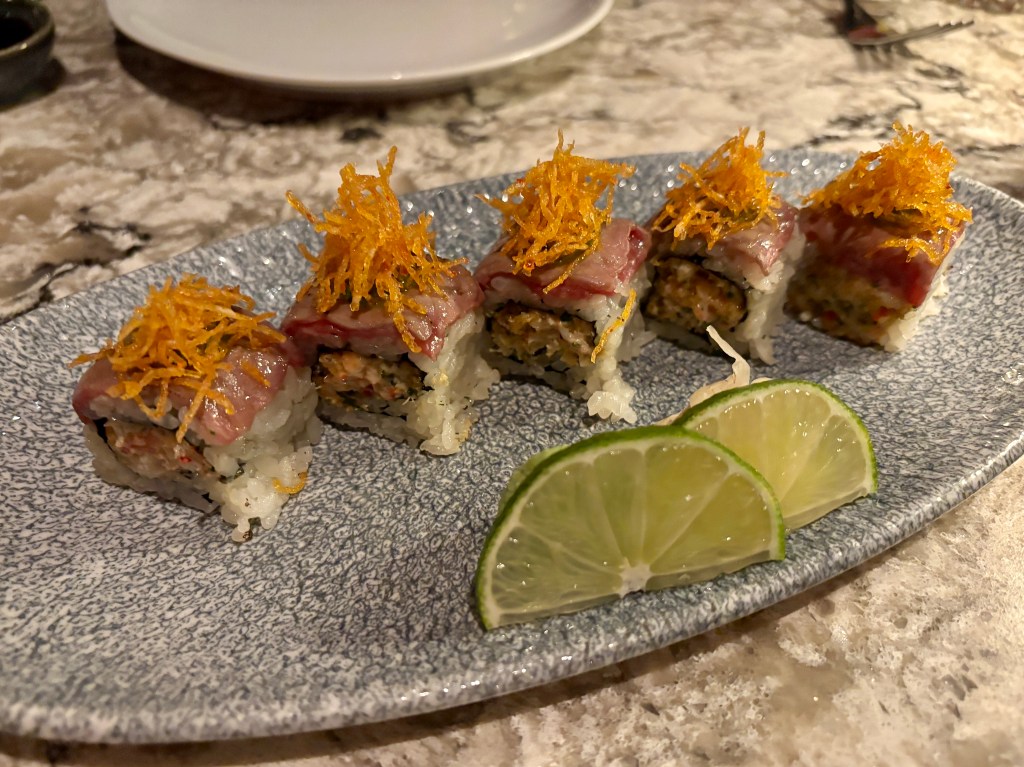 The Hellfire roll, described on the menu as “spicy tuna two ways,” is filled with tuna and crunchy slivers of pear. The roll was clean and fresh, similar to sushi you’ve probably had at many good Japanese restaurants.