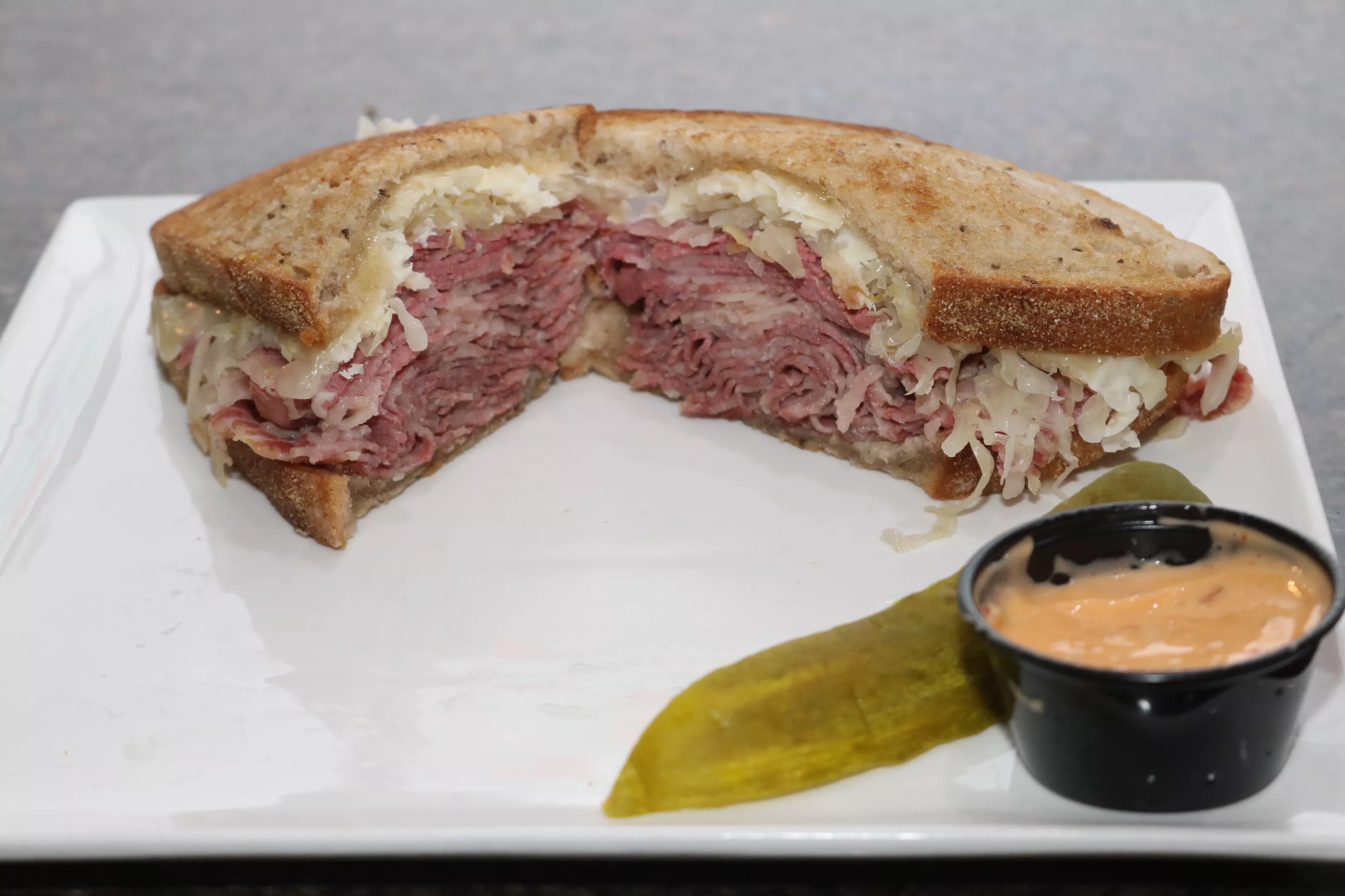 The Goldman’s Deli Rueben is stacked with corned beef, Swiss cheese, sauerkraut, and Thousand Island dressing.