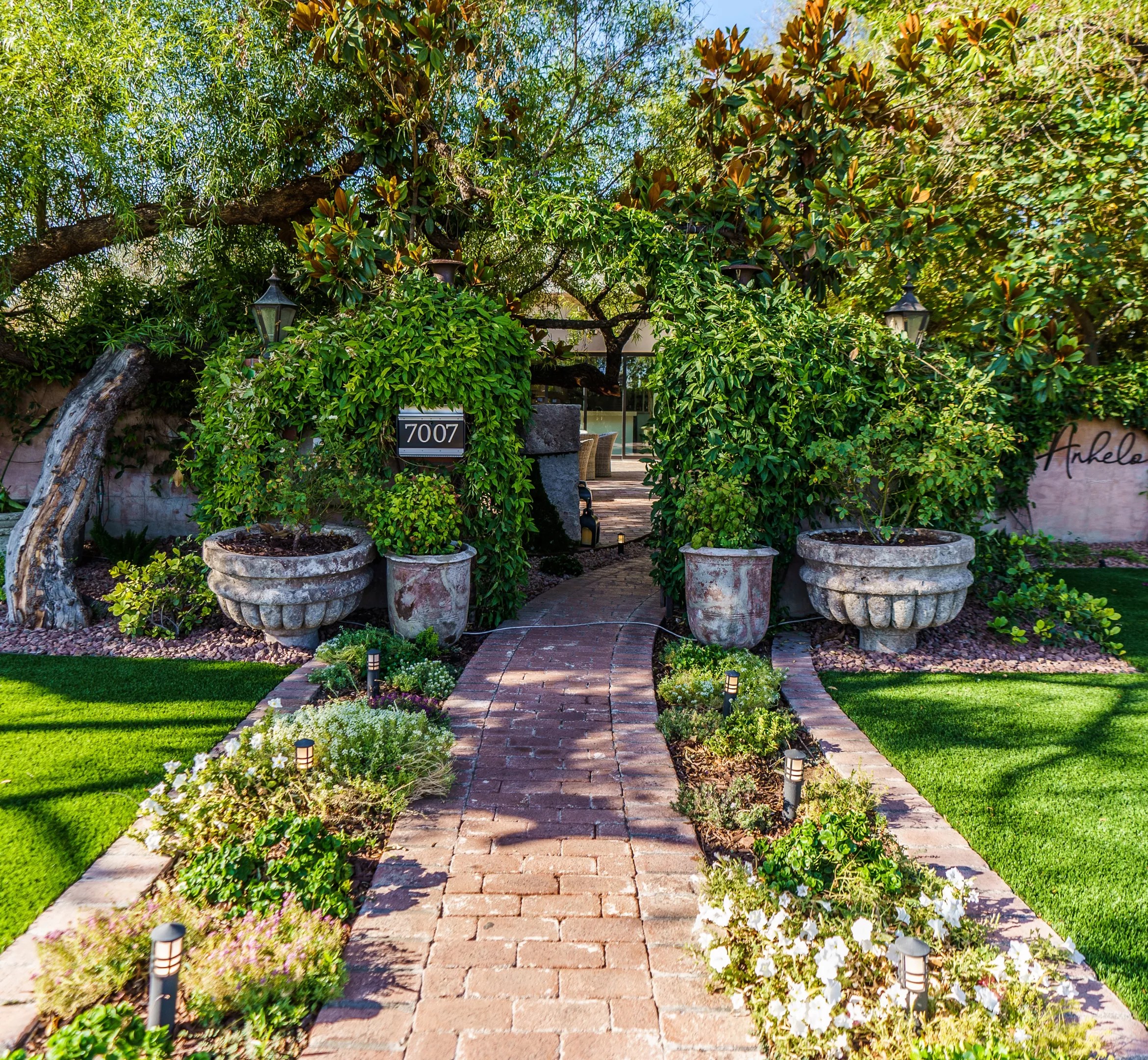 At Anhelo, sprawling lush foliage creates inviting curb appeal and a brick walkway winds through bushes, flowers and a canopy of shade trees.