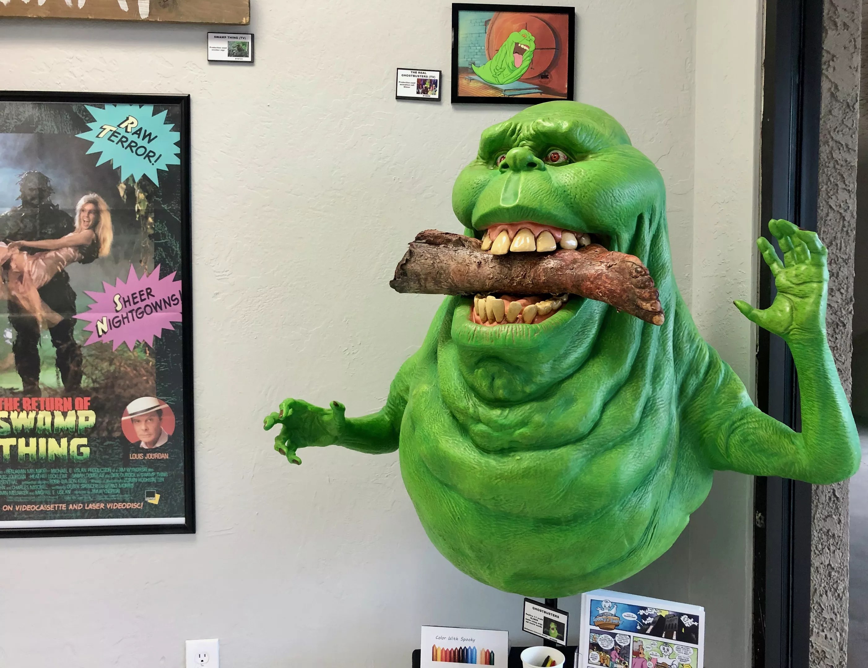 But inside, Spooky’s Swirls is a sensory overload. The bakery is bright, and at all times has a movie going on the dining room flatscreen. You want to cut for the counter, spotting some amazing cupcakes, but the almost-hidden nook of horror movie memorabilia peeking around the corner also catches your attention. Then you notice the larger-than-life Slimer to your right, and maybe an empty table you can snag to your left.