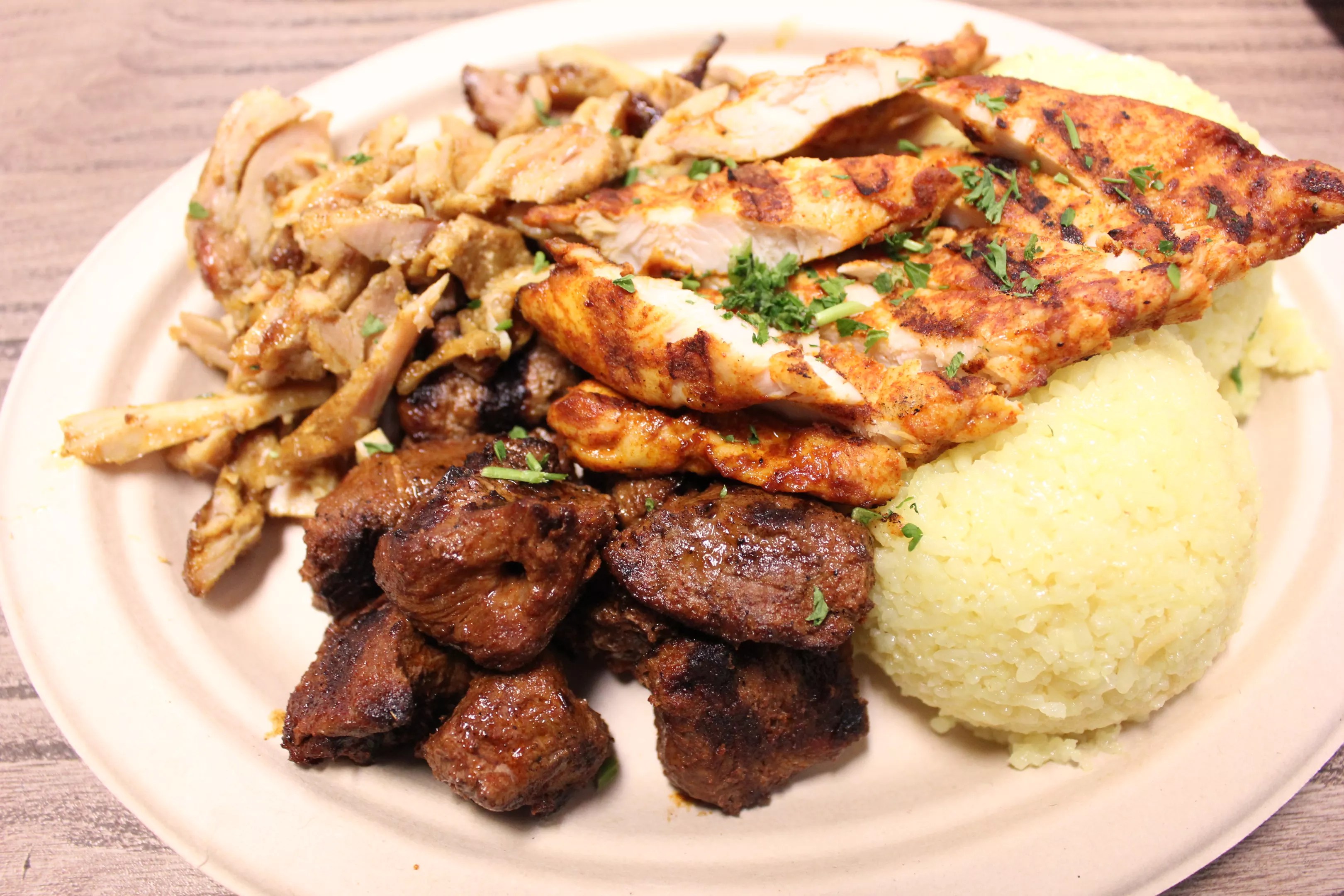 Mixed plate of four meats: three grilled, one cooked on a skewer and using a vertical broiler.