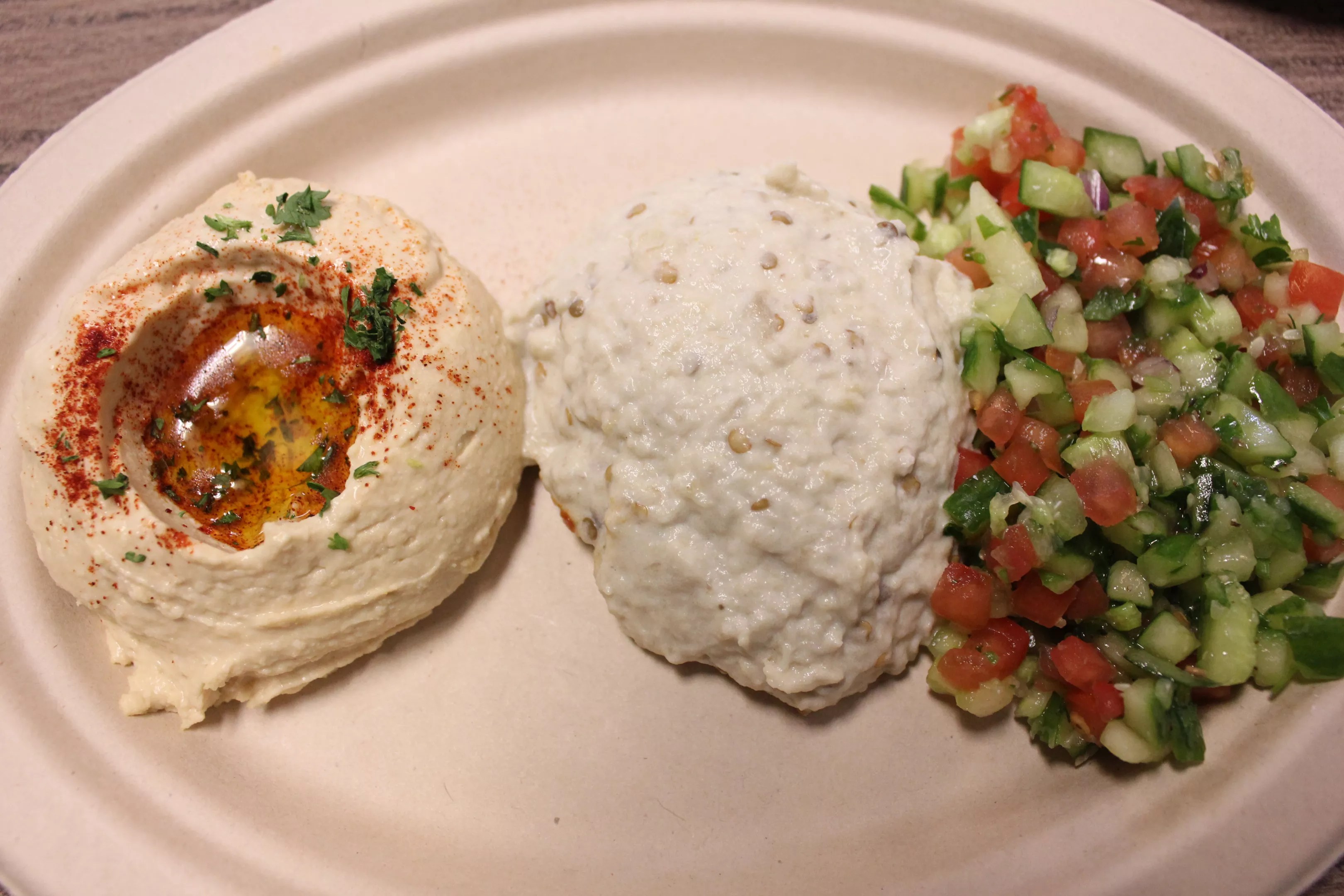 Lineup of classics from the Levant: hummus, baba ganoush, Israeli salad.