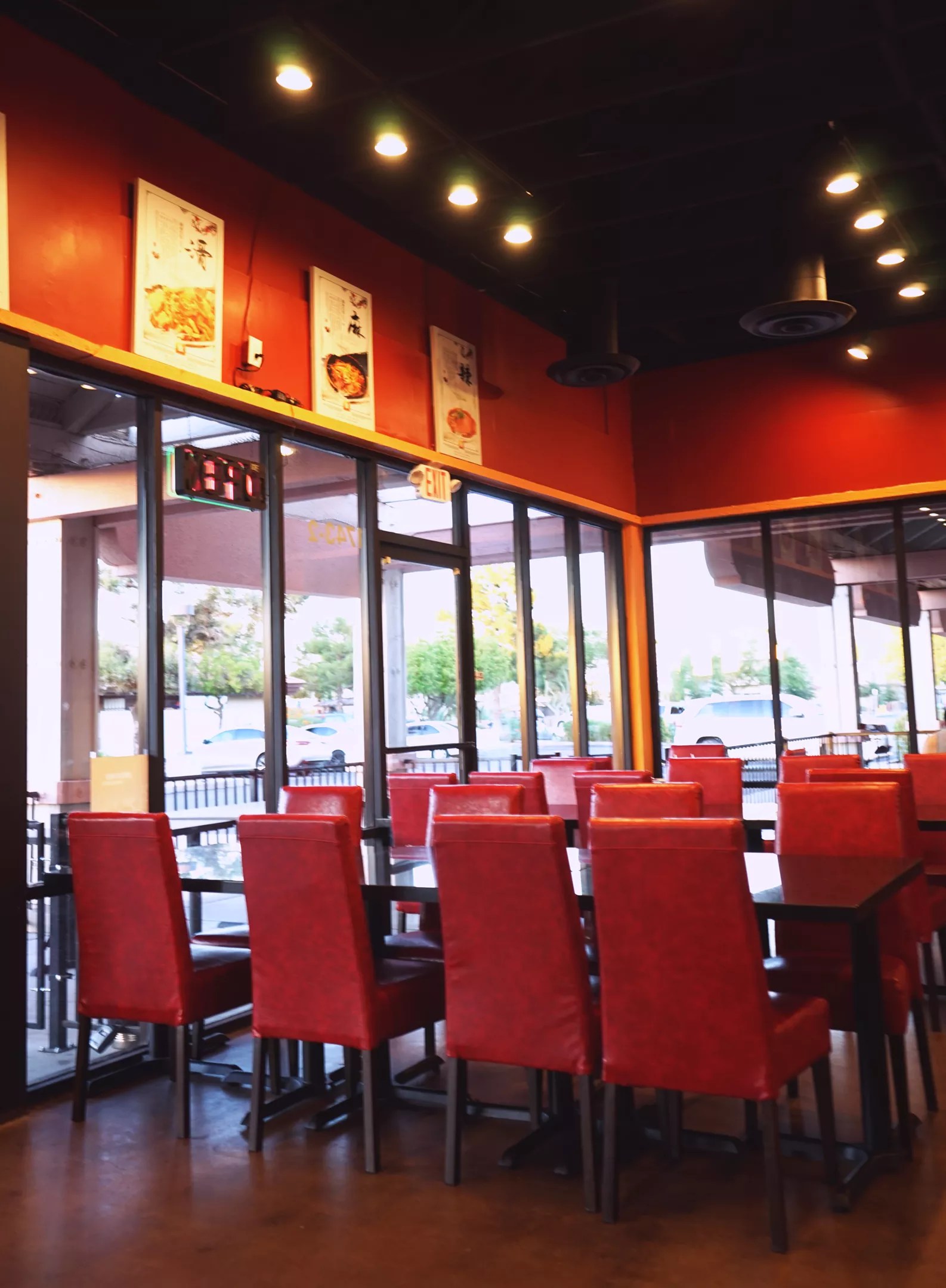 The main dining room sports festive red and orange walls adorned with calligraphy and glazed ceramic goldfish. Four large tables near the front window seat up to eight people each, and a long banquet table to the side can accommodate about 16. During a recent weeknight visit, a family gathered there to celebrate a baby shower. Smaller groups grabbing quick bites filled up the four-tops in the middle of the space, and most of the visitors seemed to be friends and regulars. People seated at different tables would often greet each other or wave before leaving.