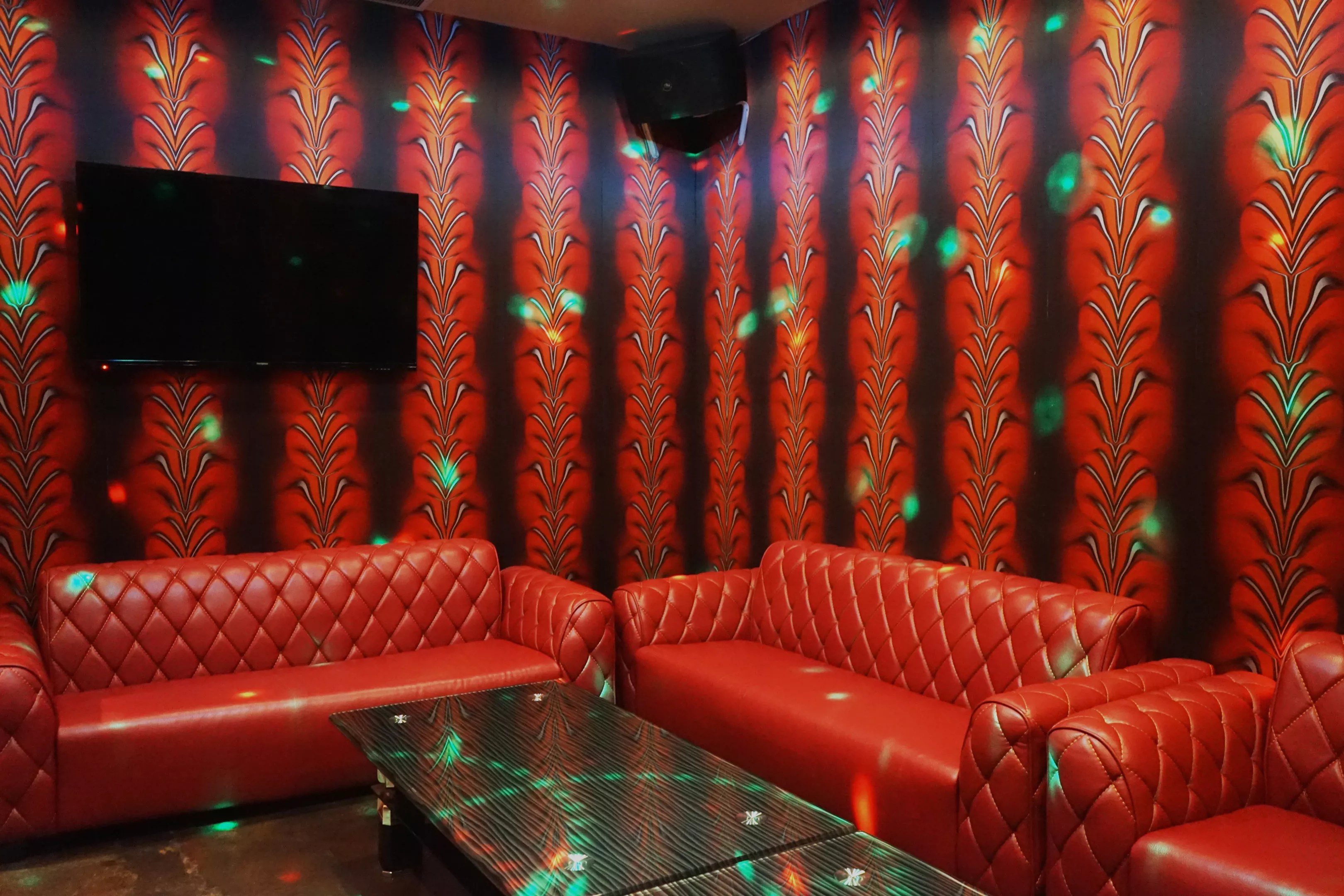 Each karaoke room has a different kind of wallpaper. The VIP room features this feathery red and black number.