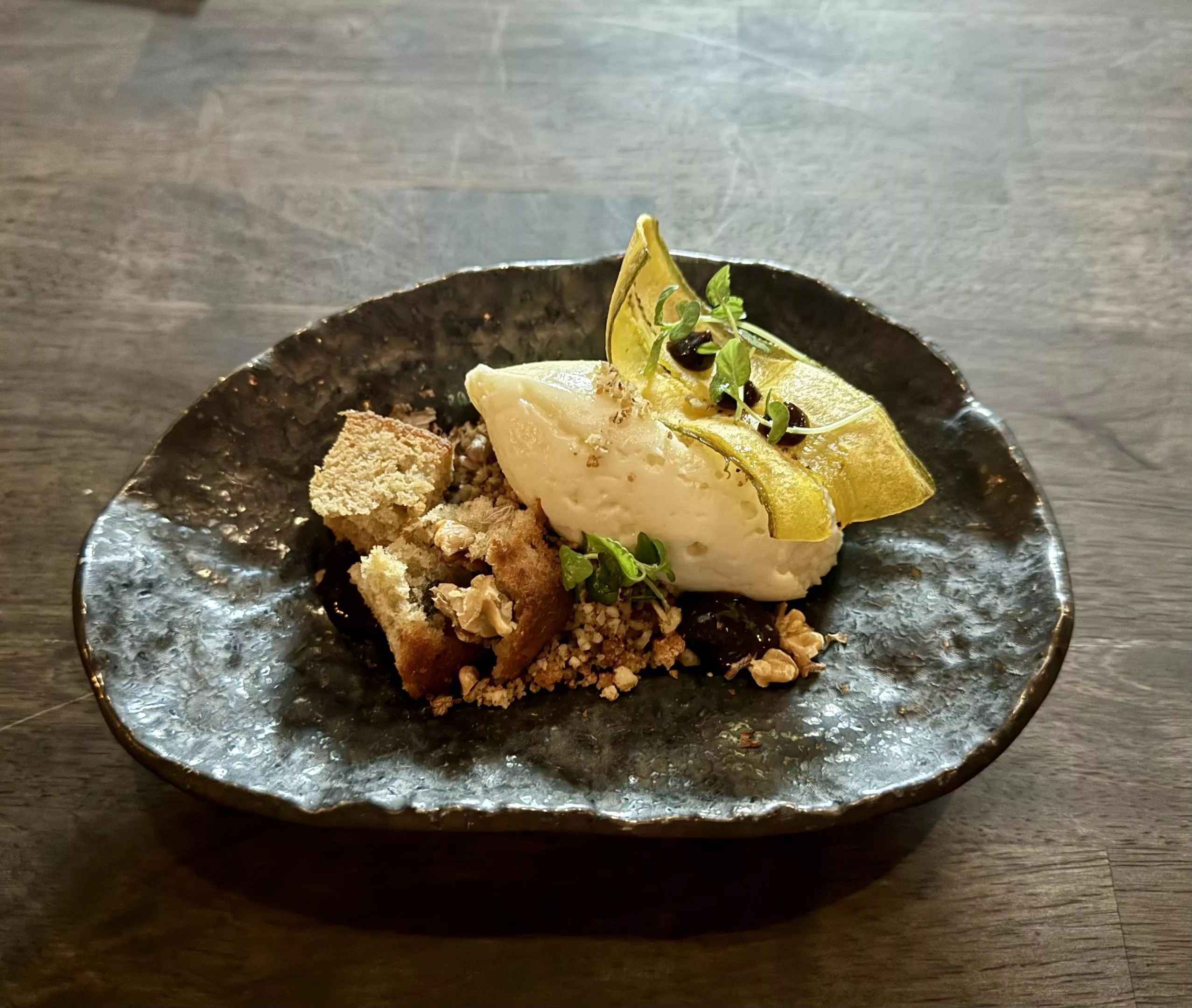 For dessert, we gave in to the temptation of the Banana Cheesecake. The dish is deconstructed, with a quenelle of cheesecake sitting atop chunks of banana bread and a mound of candied walnuts, garnished with currants and a strip of dehydrated banana. The dessert is rich in banana flavor but doesn’t err toward artificiality. The dish elevates the quick bread to a more formal dessert thanks to the creamy, indulgent cheesecake and bursts of dried fruit.