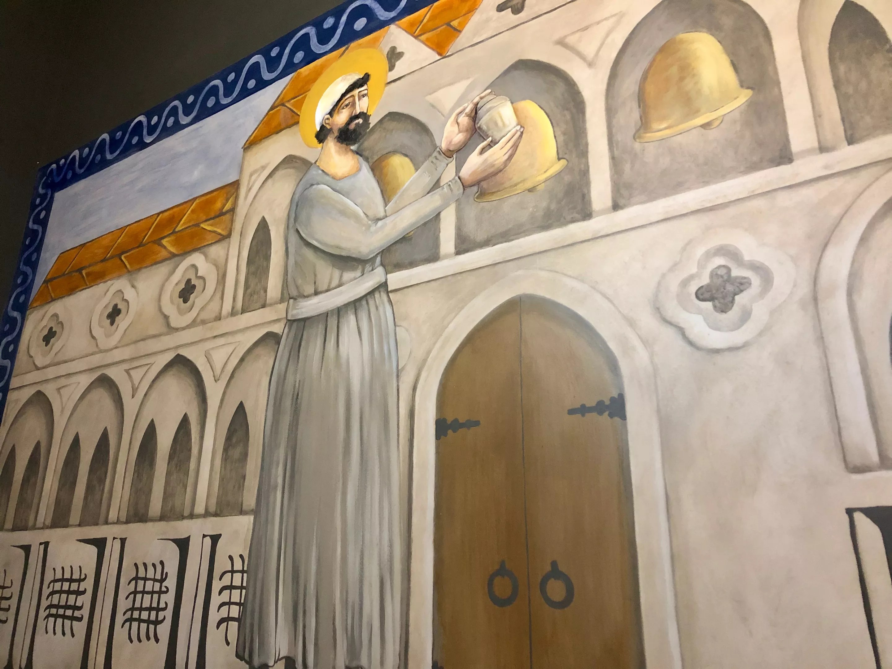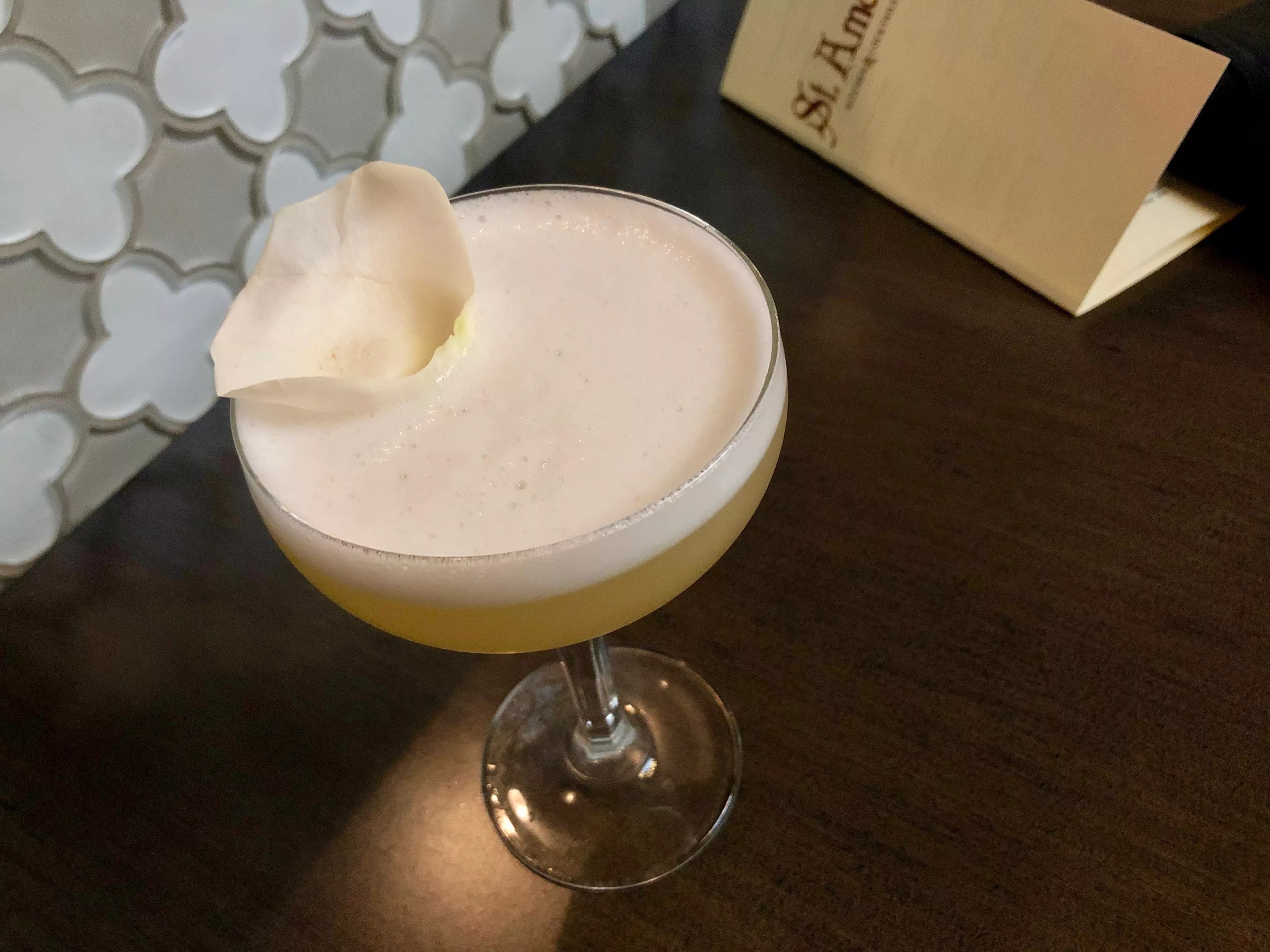 Inside, there are custom tabletops decked with napkin-wrapped silverware shaped like the cross. And walking in, diners can tell light is important. The afternoon sun glows in each room of the former D’Vine Bistro and Wine Bar, and the main dining area’s neat-looking chandeliers illuminate a mural of the man himself – St. Amand. He is the patron saint of wine-making, beer-brewing, and bartending, which creates a unique pressure for the drink program here. And that’s where we’ll start.