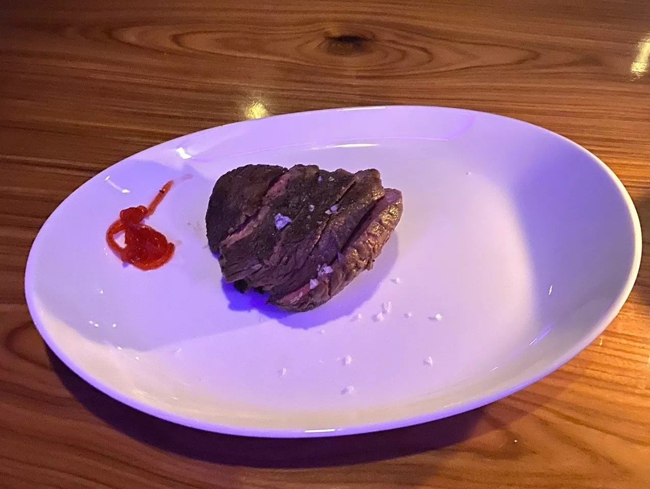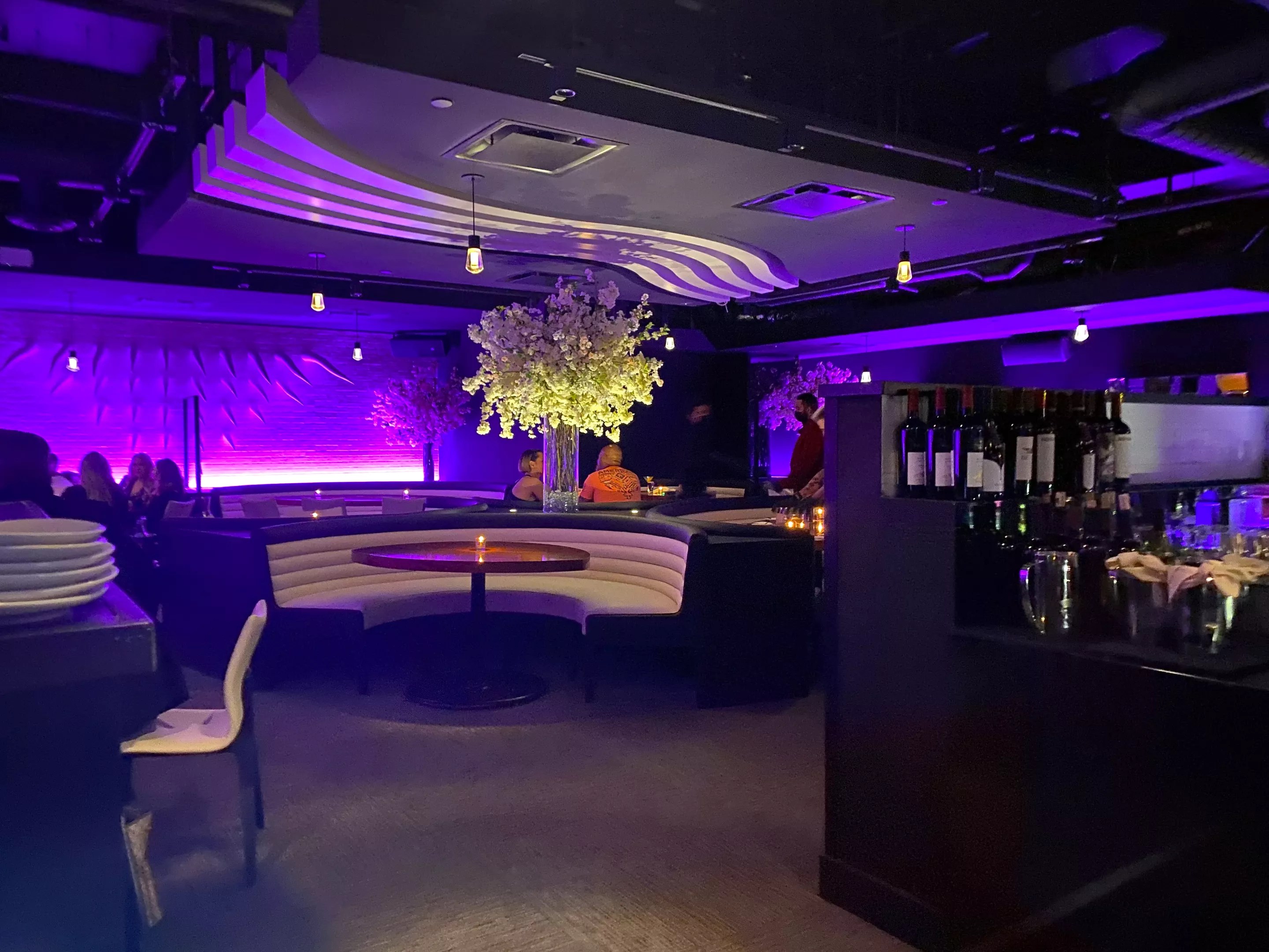 Surrounding us were violet lights and white gladiolas. A bar in the center of the room separated the main dining area from the lounge, where horns protruded from a white brick wall, apparently a signature STK design element. The Mint, a now-defunct Scottsdale dance club, came to mind.