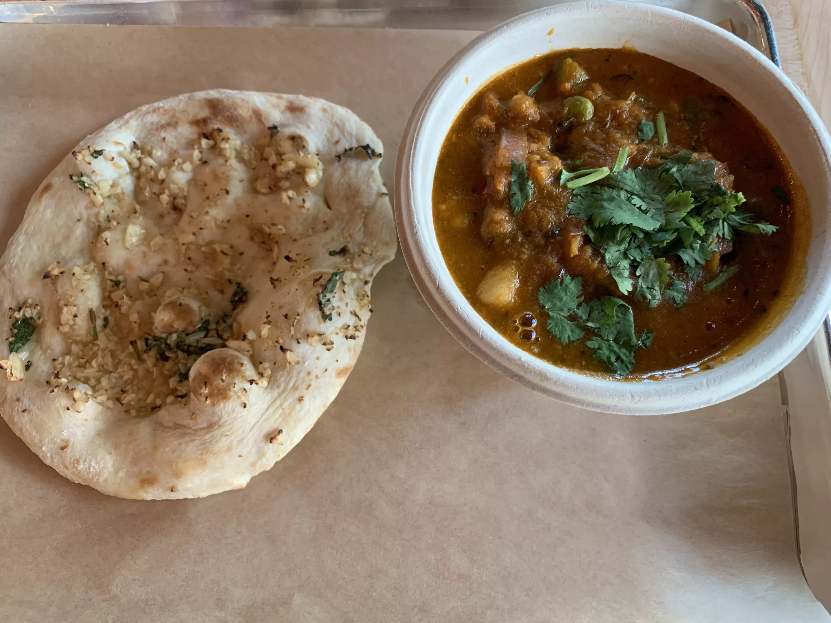 Garlic naan only enhances the curry taste, and if you choose to pair it with basmati rice, you won’t be disappointed. The rice is a loose, fluffy, multicolored mixture which combines well with the vegetables. Other vegetarian bowls include chole masala, malai kofta, and aloo saag. (Again there is a brief description of each entree, so it is user-friendly to those who may have never heard of these items.)