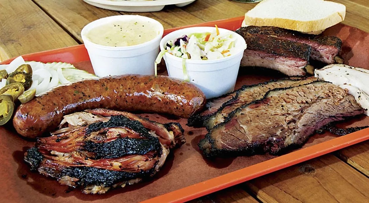 This barbecue platter includes brisket (fatty, lean, and burnt ends), turkey, ribs, and a sausage link, plus garnish and white bread at Little Miss BBQ.