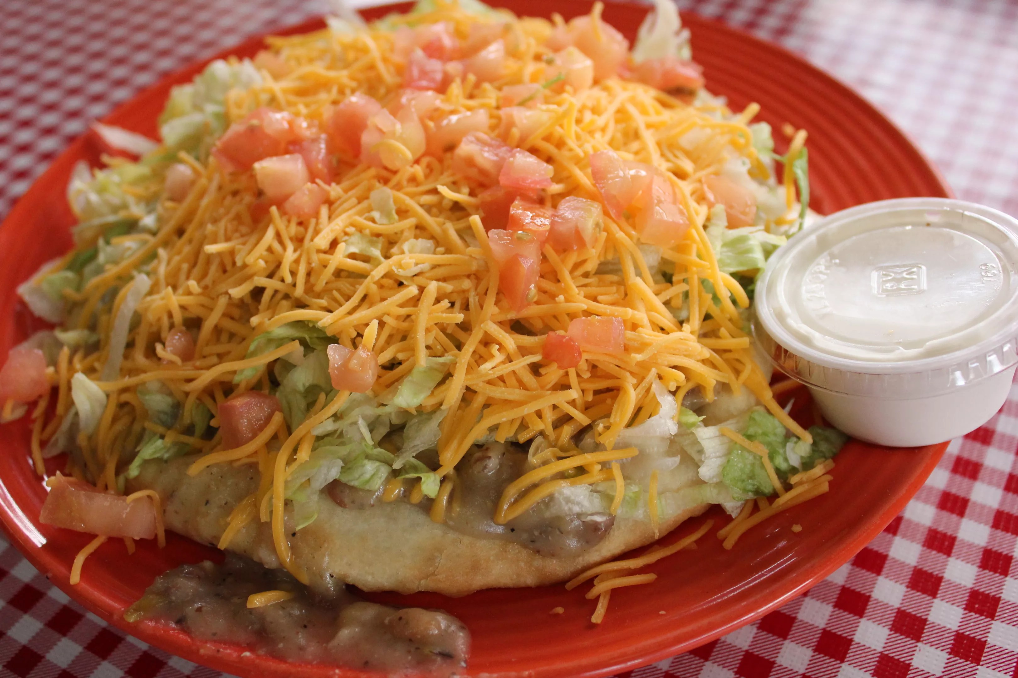 The walls are red and yellow brick, stucco and cinderblock. A man eating lunch with his family slowly rises, walks to Carlos. He just devastated an “Indian taco” as big as my head. “Could I get two fry breads to-go with everything on the side?” he asks. “We have a four hour drive.”