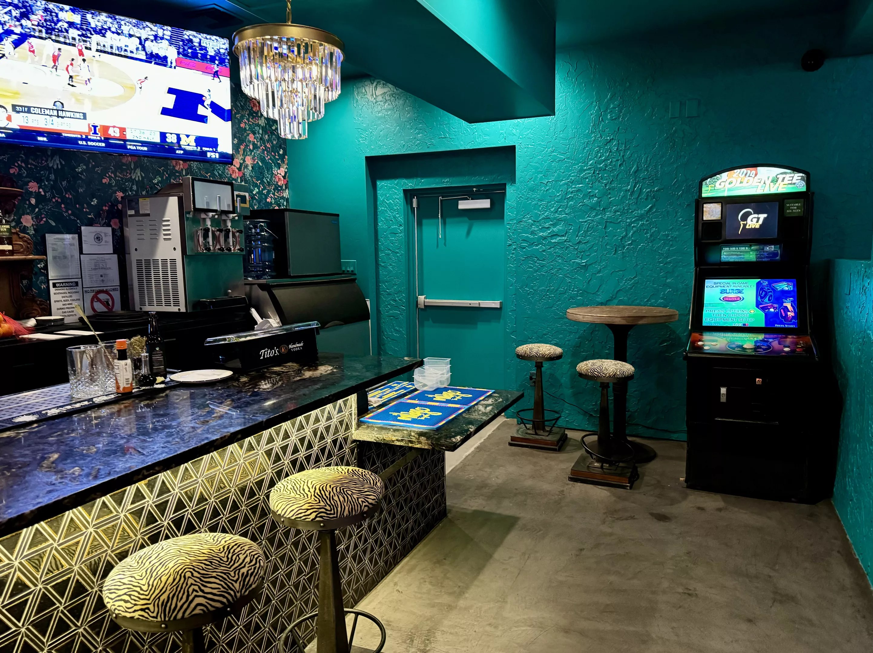 In contrast to the dining room, the bar takes cues from English-style pubs and has a rich emerald color palette and floral wallpaper. TVs show the game and a Golden Tee Golf arcade game is nestled in a corner.