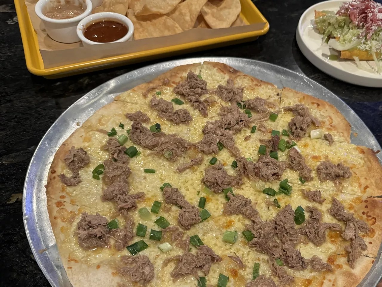 A massive cheese crisp topped with duck carnitas, rolled tacos and chips and dips are among the bar snacks.