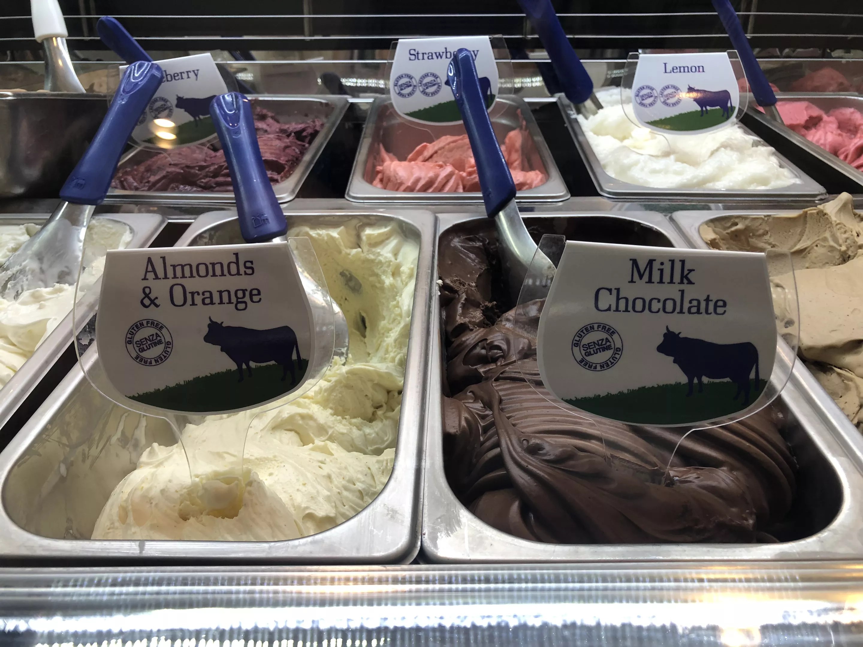 On a recent visit, there were 11 gelato flavors and four sorbetto. Gelato ranged from vanilla flavors like chocolate to flavors that may seem outlandish, but, to an Italian palate, are standard: almond, cream, pistachio, and Amarena (cherry).