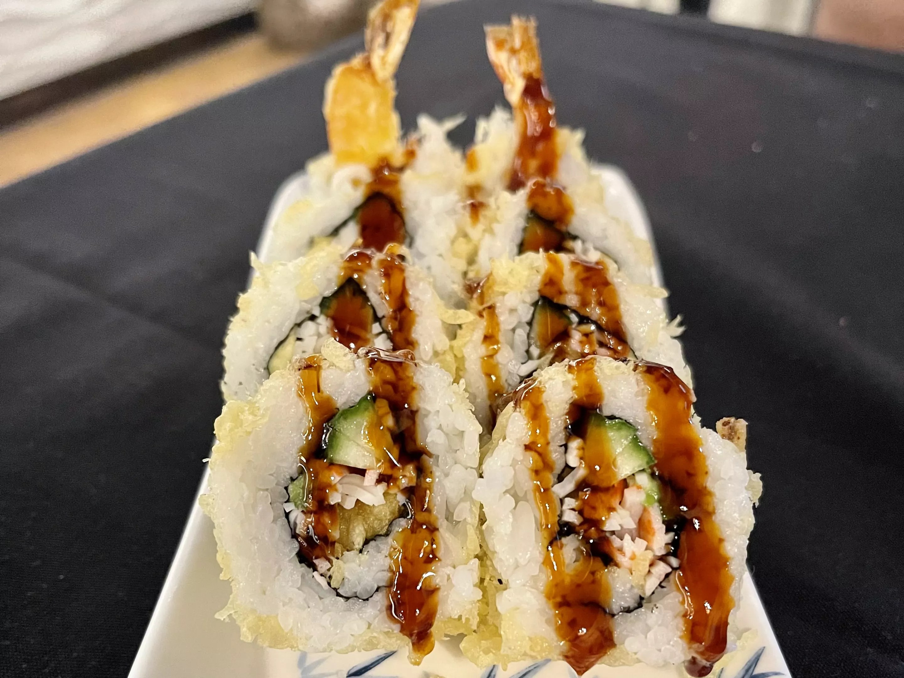 The shrimp tempura roll at Hana Japanese Restaurant showcases the signature crunch of the tempura batter used throughout the menu.