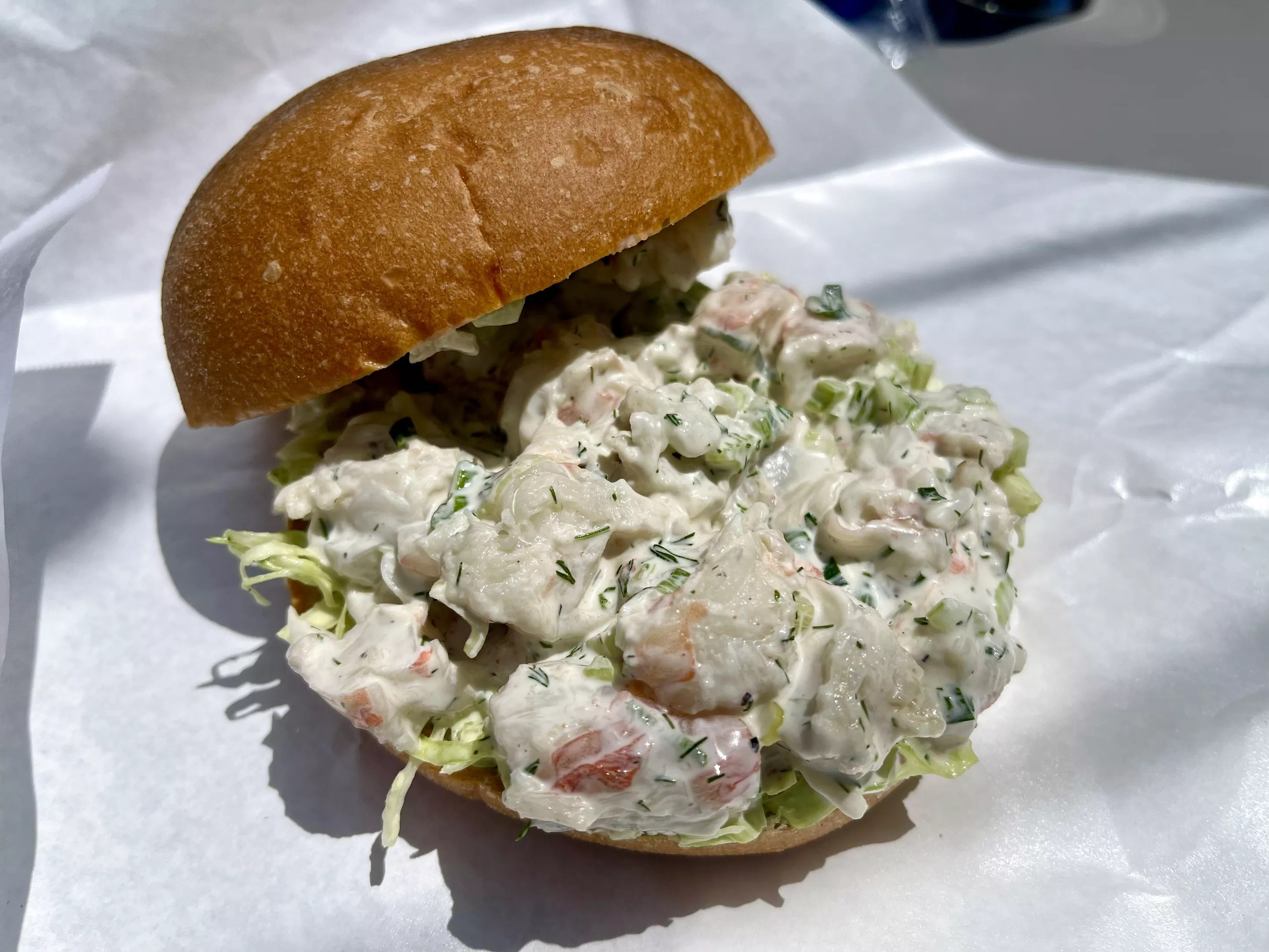 A sandwich filled with cool, creamy shrimp salad is the perfect summer bite at Nelson’s Meat + Fish.