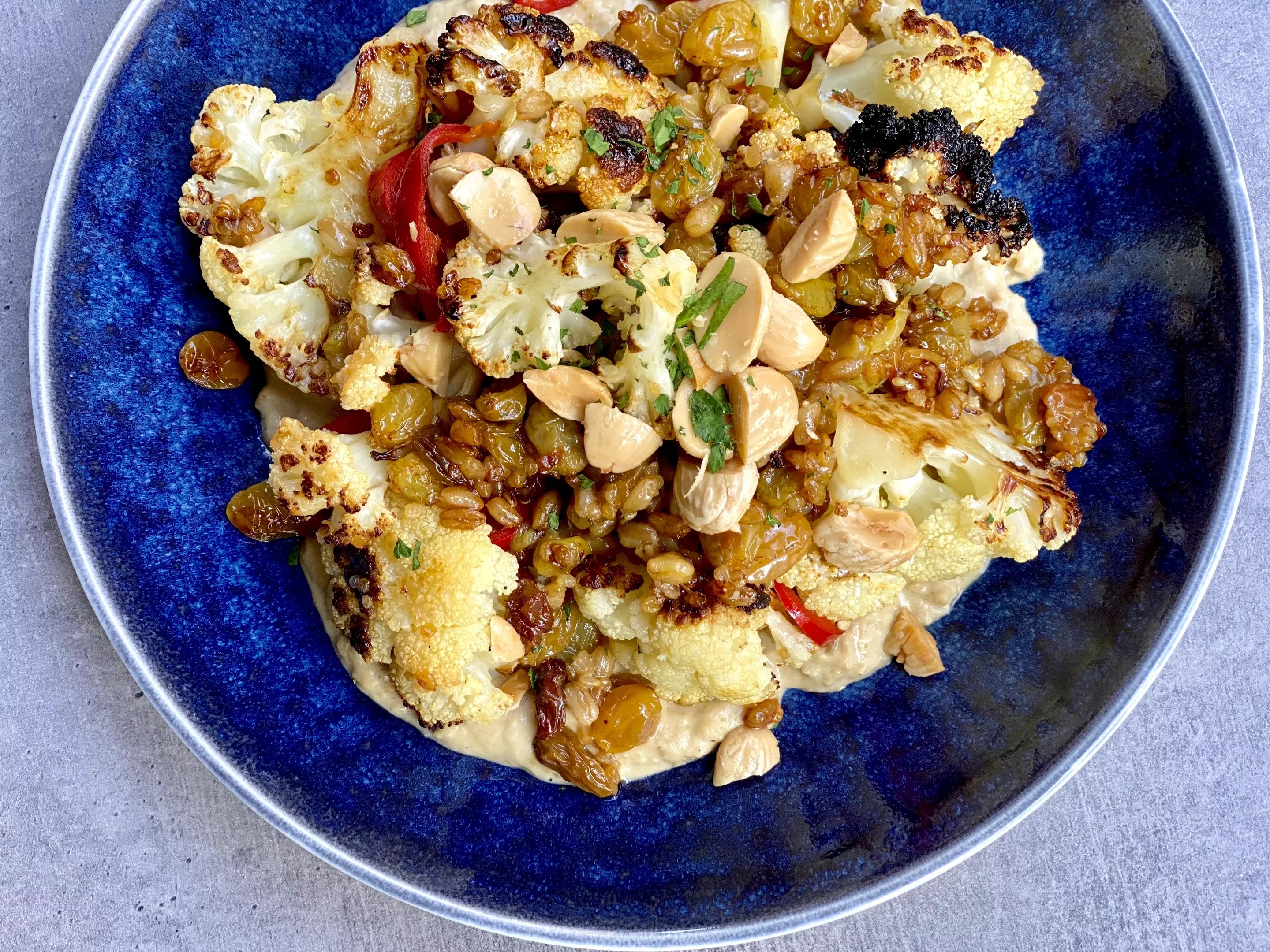 Happy hour cauliflower is a dive in delight of creamy hummus, sweet golden raisins, and buttery Marcona almonds.