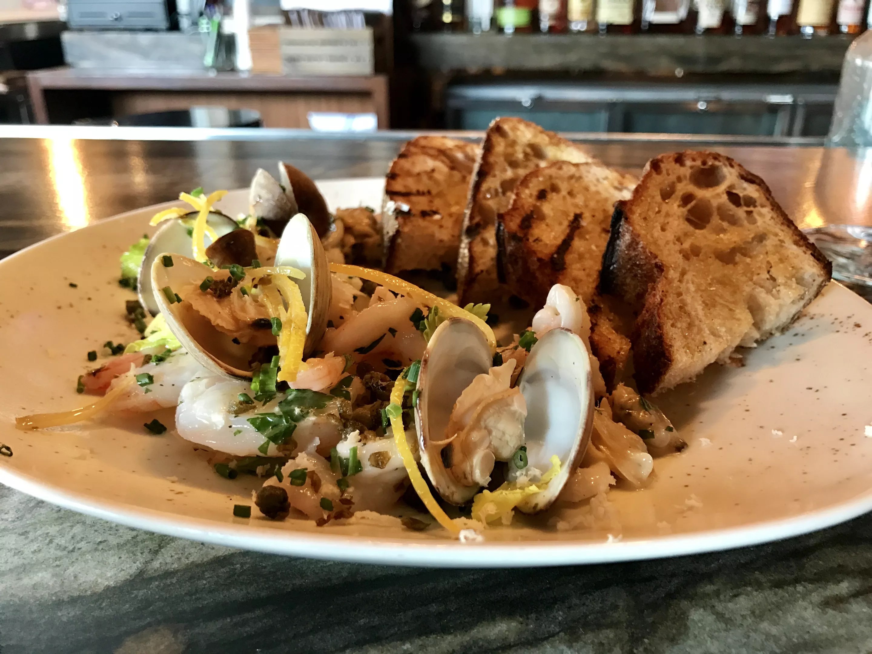 The Food: Finding the best deal during happy hour here will require a bit of cross-referencing. A charcuterie board promises fine meats, cheese, and accoutrements, but at $20 (normally $25), it’s a stretch to call it a “deal.” The other easy-to-find special is a cheeseburger and fries for $6 – far more happy hour-y. As for the other items, you will need to whip out your dinner menu and fine-tooth comb: some appetizers are half-off, but this excludes any pasta dishes. By the time you find something you want that qualifies for happy hour, you’ll be starving. The good news is that our order, the frutti di mare, was perfection – a cold calamari dish, with citrus and horseradish, for just $7.50 instead of $15. Woot woot.