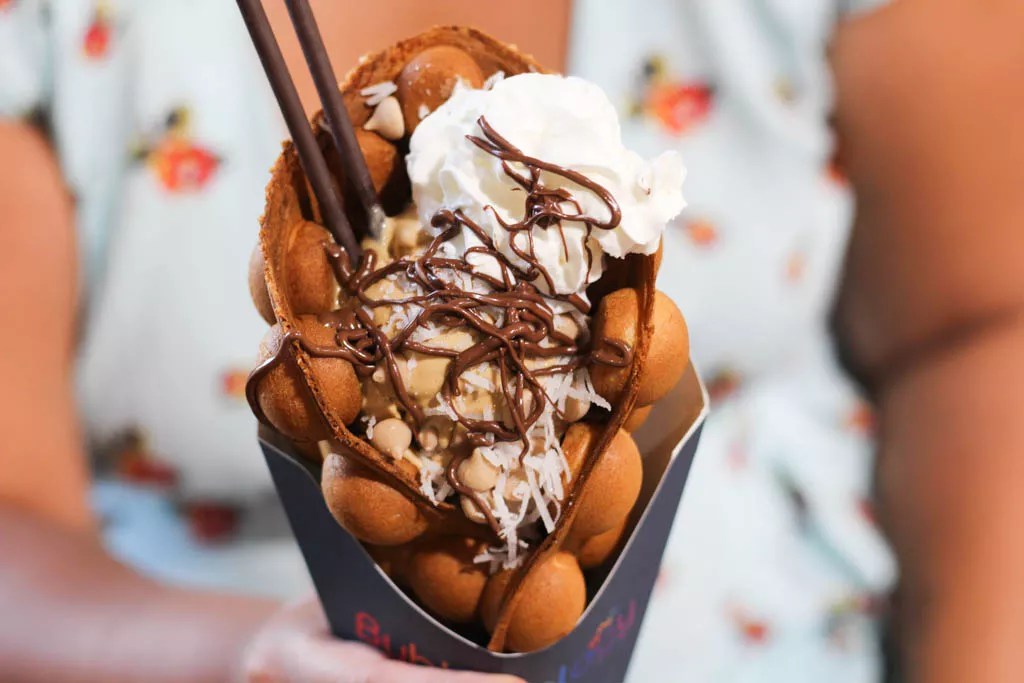 Unlike other bubble waffles piled with ice cream, the London-based Bubbleology comes with gelato (or sorbet, if you’re vegan), and rotates six flavors, like strawberry cheesecake and cookies and cream. If you’re a fruit lover, order the Summer Crunch, which has fresh strawberries and strawberry Pocky. Chocolate lover? Go for The Nutty Professor, which includes some Ferrero Rocher.
